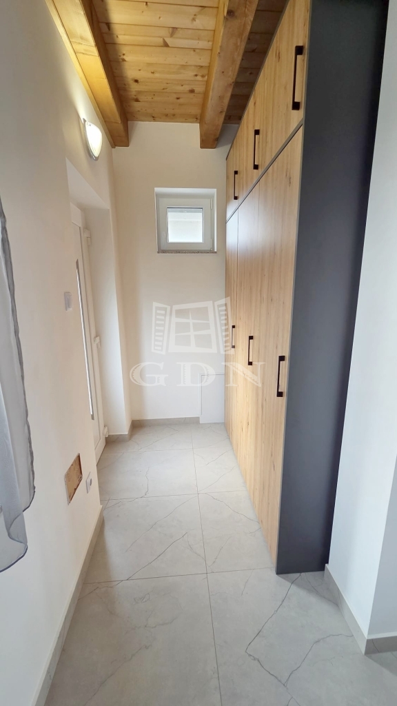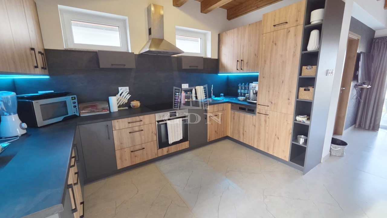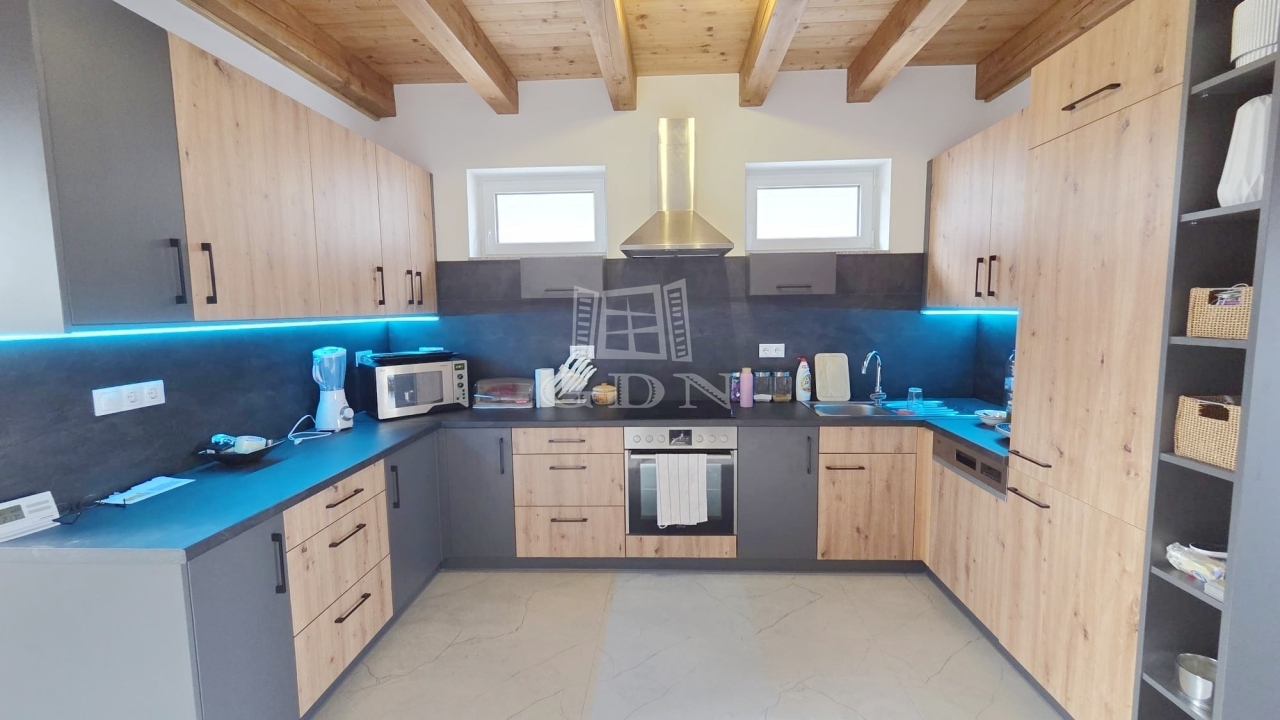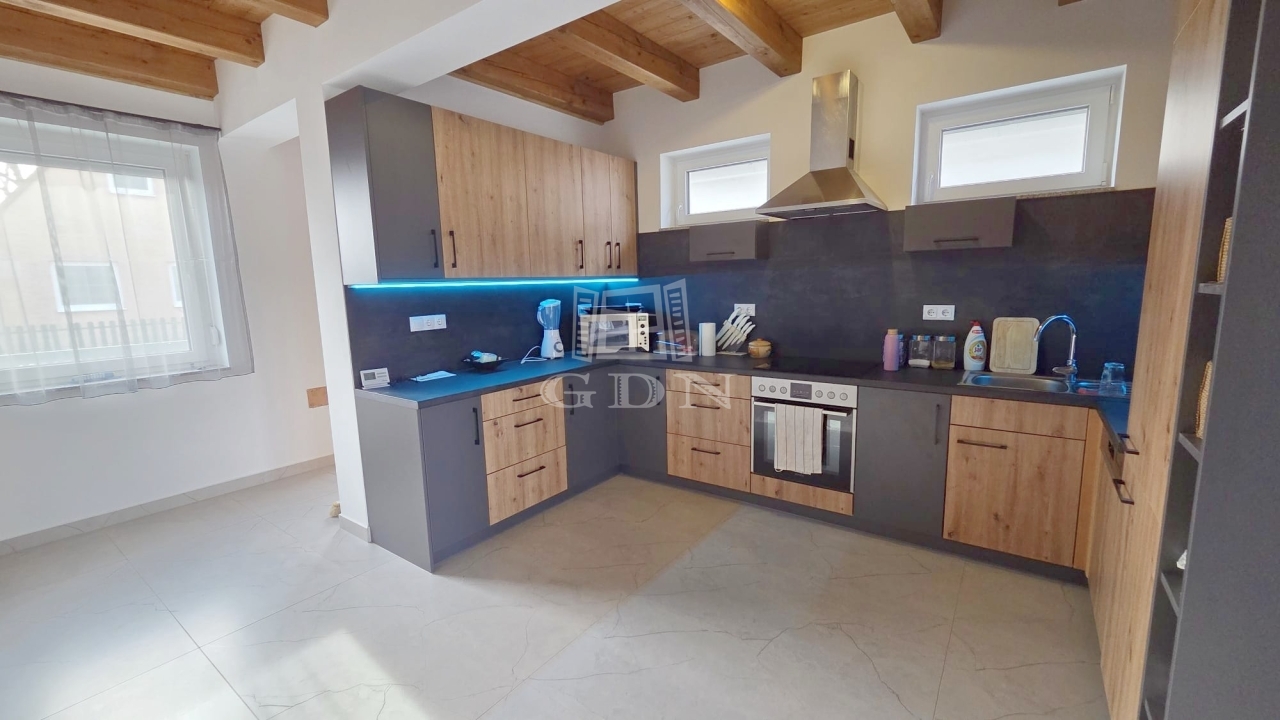 Az emeleten további két hálószoba és egy fürdőszoba található, így ideális vendégek vagy család számára is. A földszinti látszó fa gerendák meleg, természetes hangulatot teremtenek, amely harmonikusan illeszkedik a modern belső térhez.