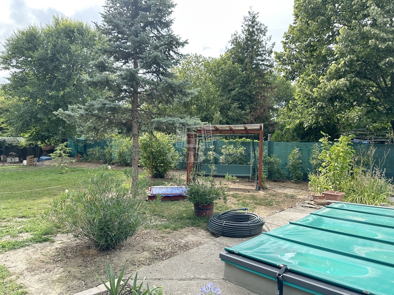 Az épület a 90-es években beton alapra, tégla falazattal épült, külső szigeteléssel ellátott, betoncserép tetőzettel rendelkezik (110 nm). A parkosított kertben (885 nm) medence, a kert végében kutya kennel, tárolók és baromfi tartásra kialakított alkalmas udvarrész is található a málna, eper és veteményes kert mellett.