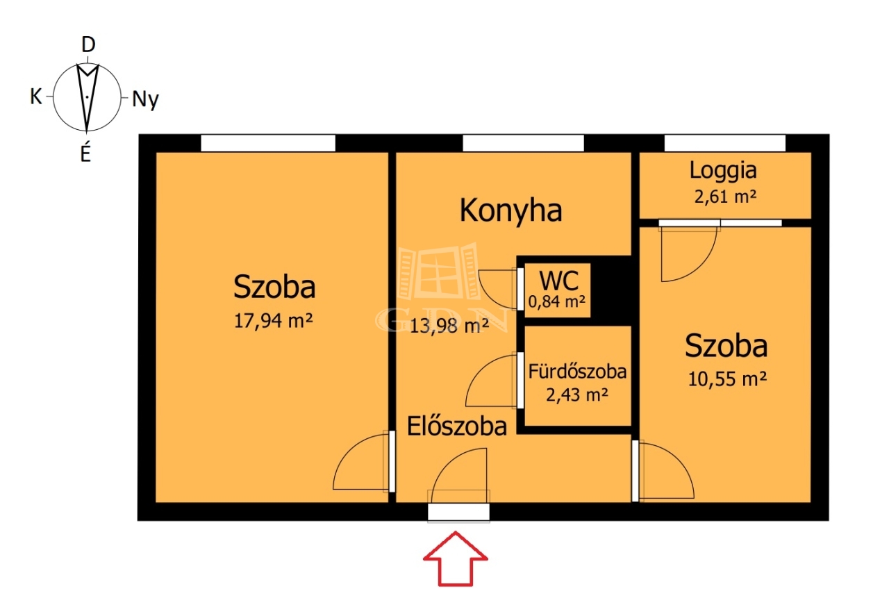 47m2-es, 1 + fél szobás, 4. emeleti lakás.