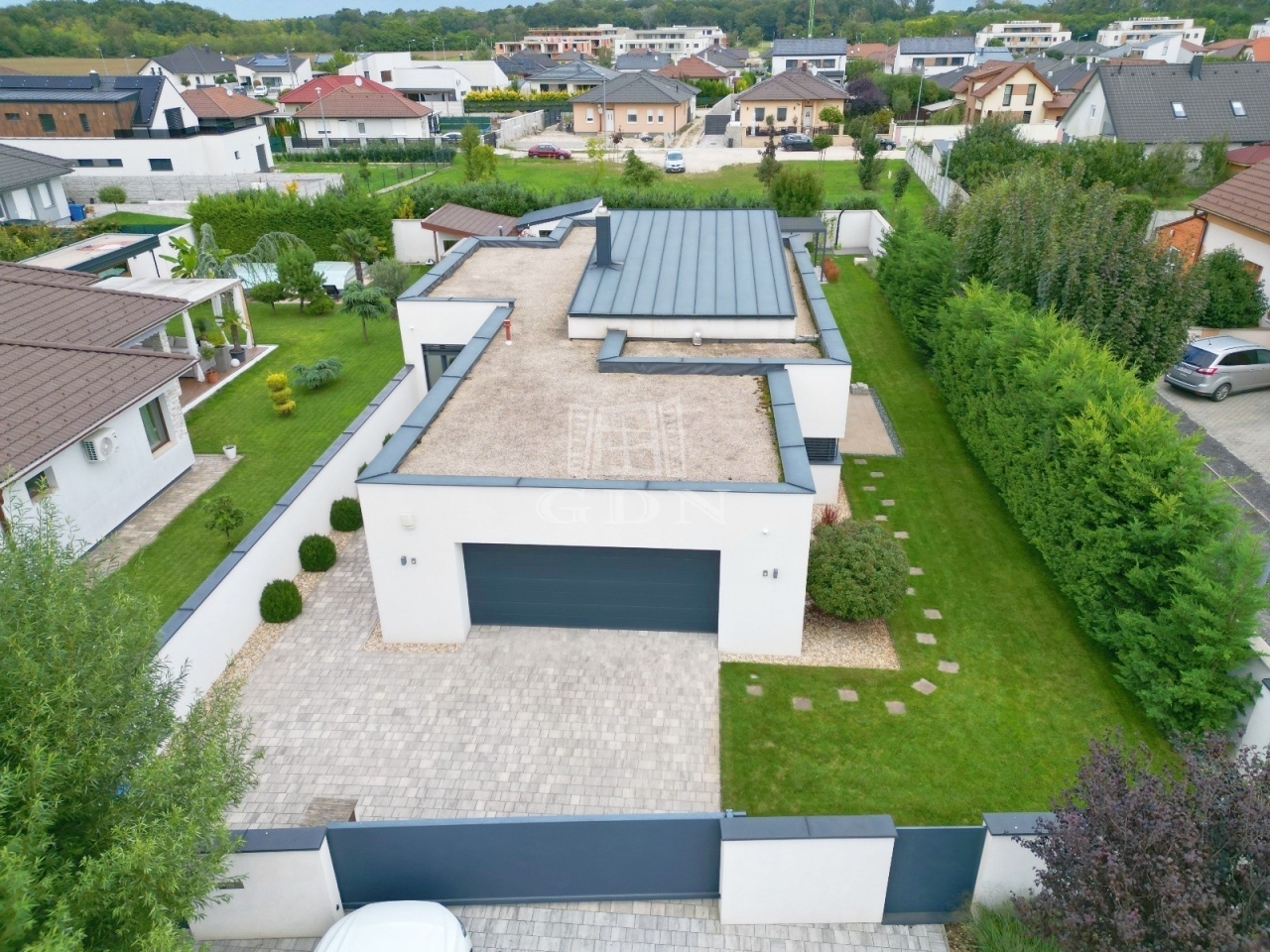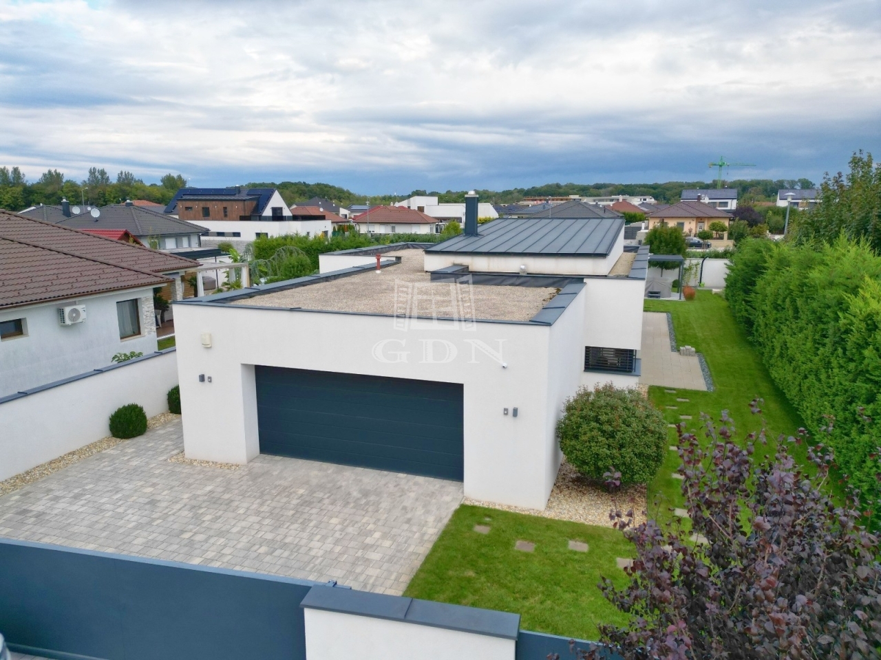 A 745 m²-es telek téglafallal körbekerített, a kert automata öntözőrendszerrel ellátott, amely mobilalkalmazáson keresztül vezérelhető. Emellett robotfűnyíró is rendelkezésre áll. A telken egy 10 m²-es kerti tároló is található.