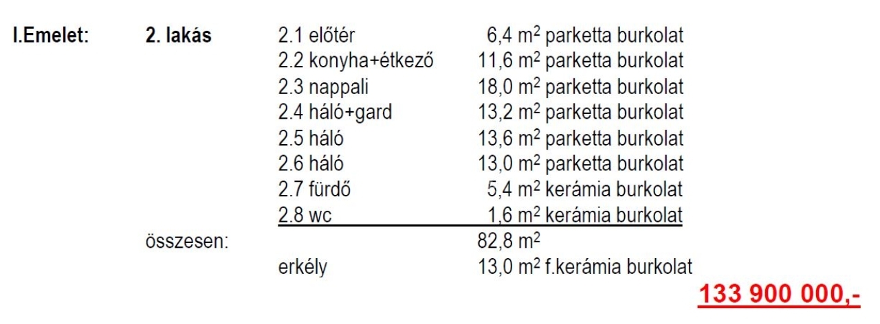 A lakás alaprajza és a helységek listája a képek között megtalálható.