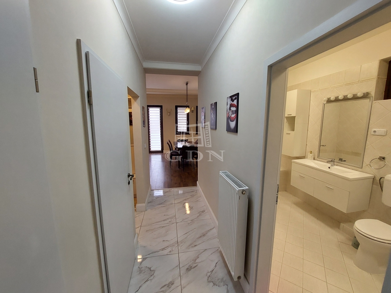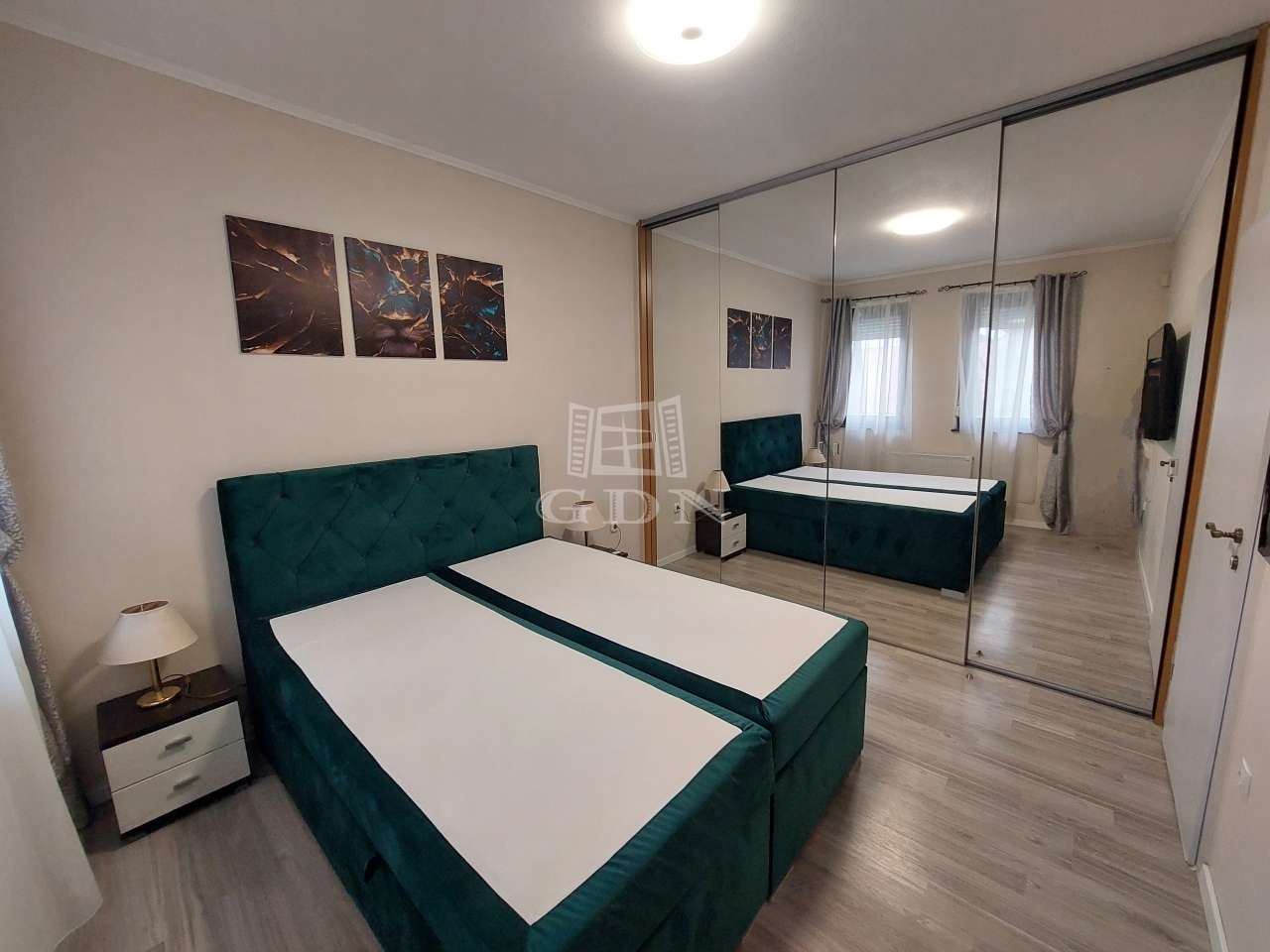 A belső elrendezés minden részlete tudatos tervezés eredménye. Az előtérből külön vendég WC nyílik, valamint egy exkluzív fürdőszoba, ahol wc, kád és zuhany is rendelkezésre áll. A hálószobában egyedi, tükörajtós beépített gardrób teszi izgalmassá a teret és biztosítja a maximális kényelmet. Innen tárul fel a lakás reprezentatív központja: a nagyvonalú, amerikai konyhás nappali–étkező, amely tökéletes teret ad elegáns vendéglátáshoz és meghitt mindennapokhoz egyaránt.