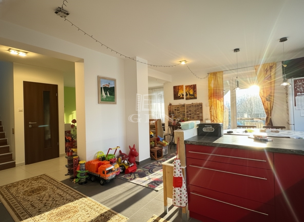 Az alsó szinten tágas közlekedő/előszoba, WC, fürdőszoba beépített zuhanyzóval, amerikai konyha-nappali teraszkapcsolattal került kialakításra.