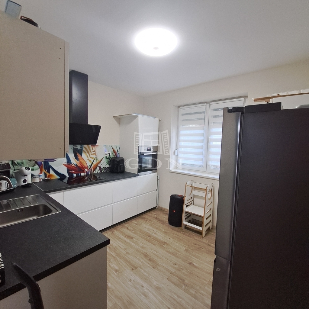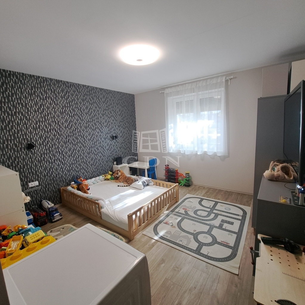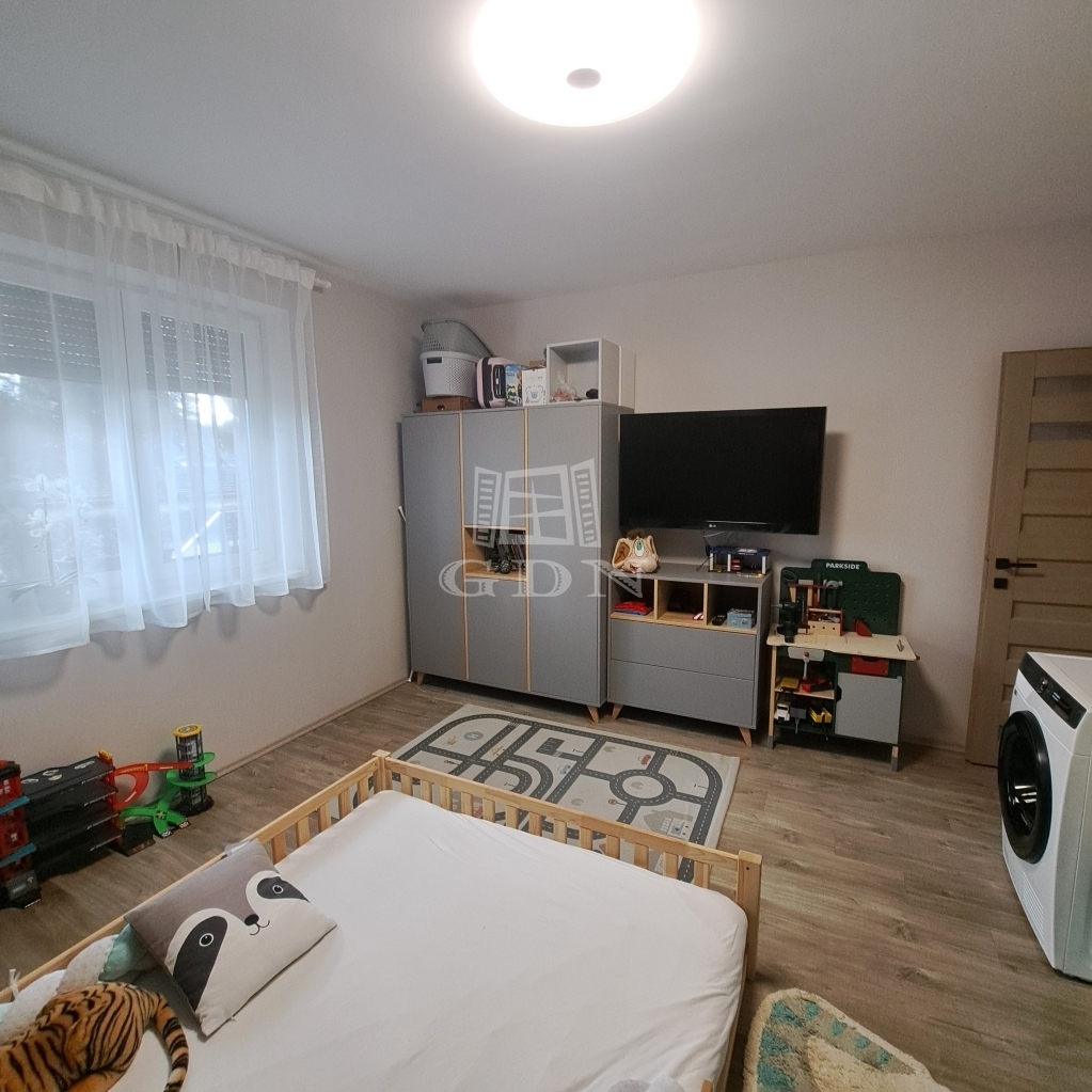 - A lépcsős, fedett bejáratról a tágas nappali-étkezőbe jutunk. Innen nyílik a 2 szoba, a konyha, a fürdőszoba és a WC.