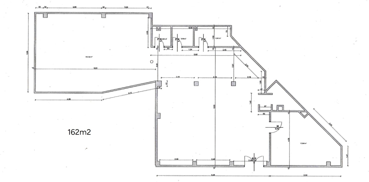Az üzlethelyiség jelenleg két részre, egy 138m2 és egy 162m2 alapterületű egységre van bontva. Igény esetén összenyitva, egyben vagy megosztva, a jelenlegi állapotában is bérbe vehető.