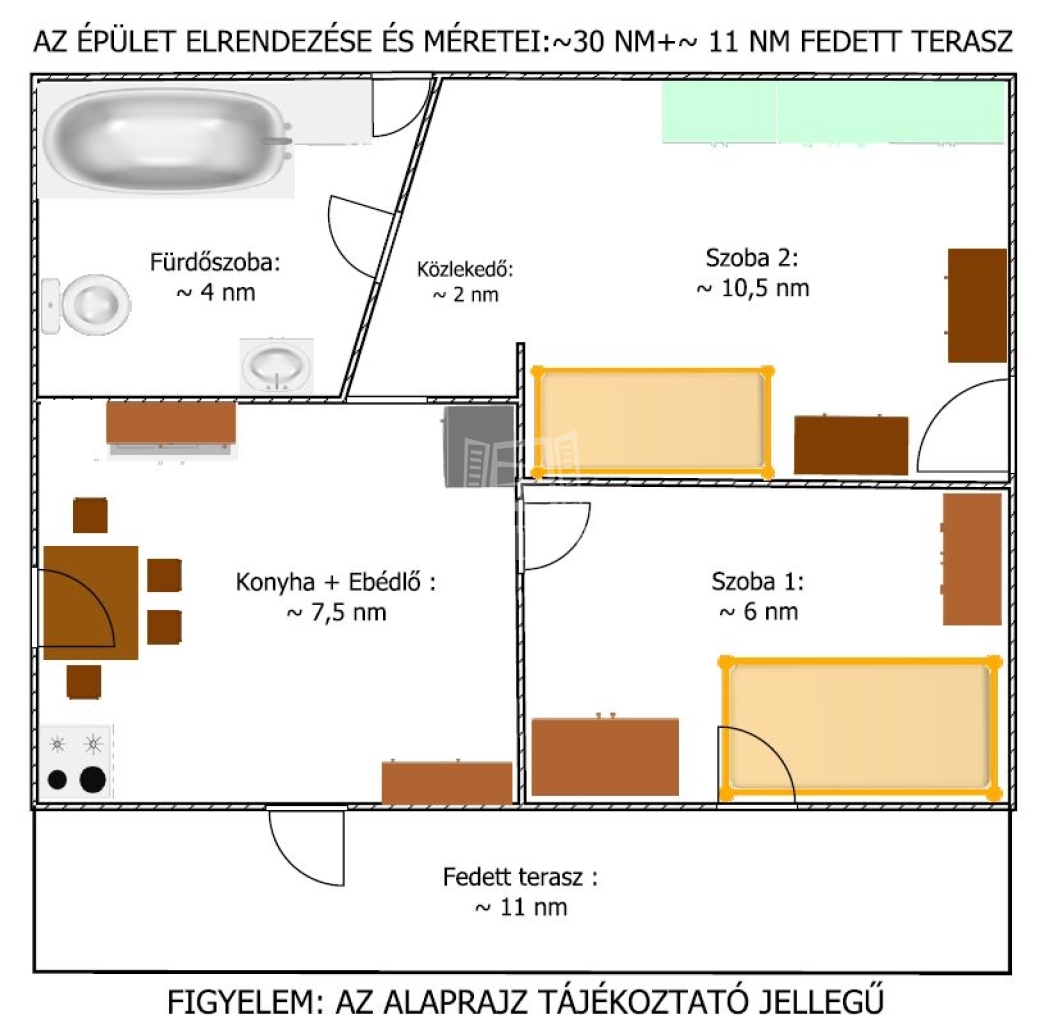 - főépület mérete: 30 nm+ 11 nm fedett terasz,