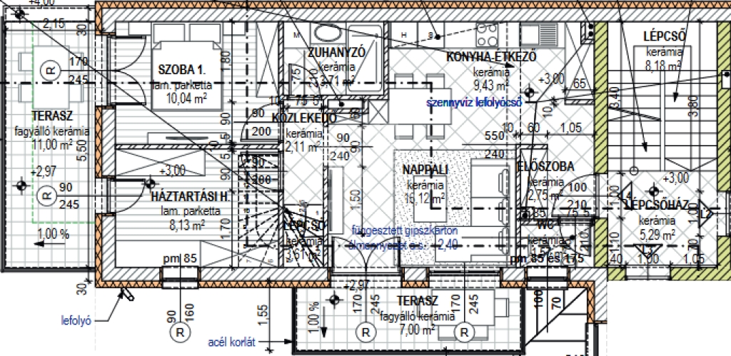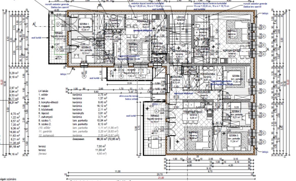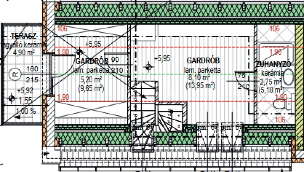 (nettó 73.52 m2) + 11 m2, 7 m2, 5,92 m2 teraszokkal első emeleti belső kétszintes. Amerikai konyhás nappali, 3 hálószoba, előszoba, közlekedő, gardrób, 2 fürdőszoba, külön wc került kialakításra.