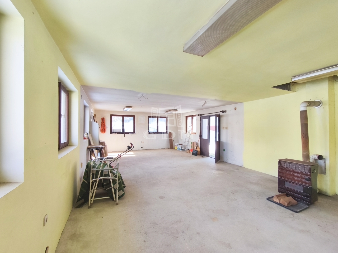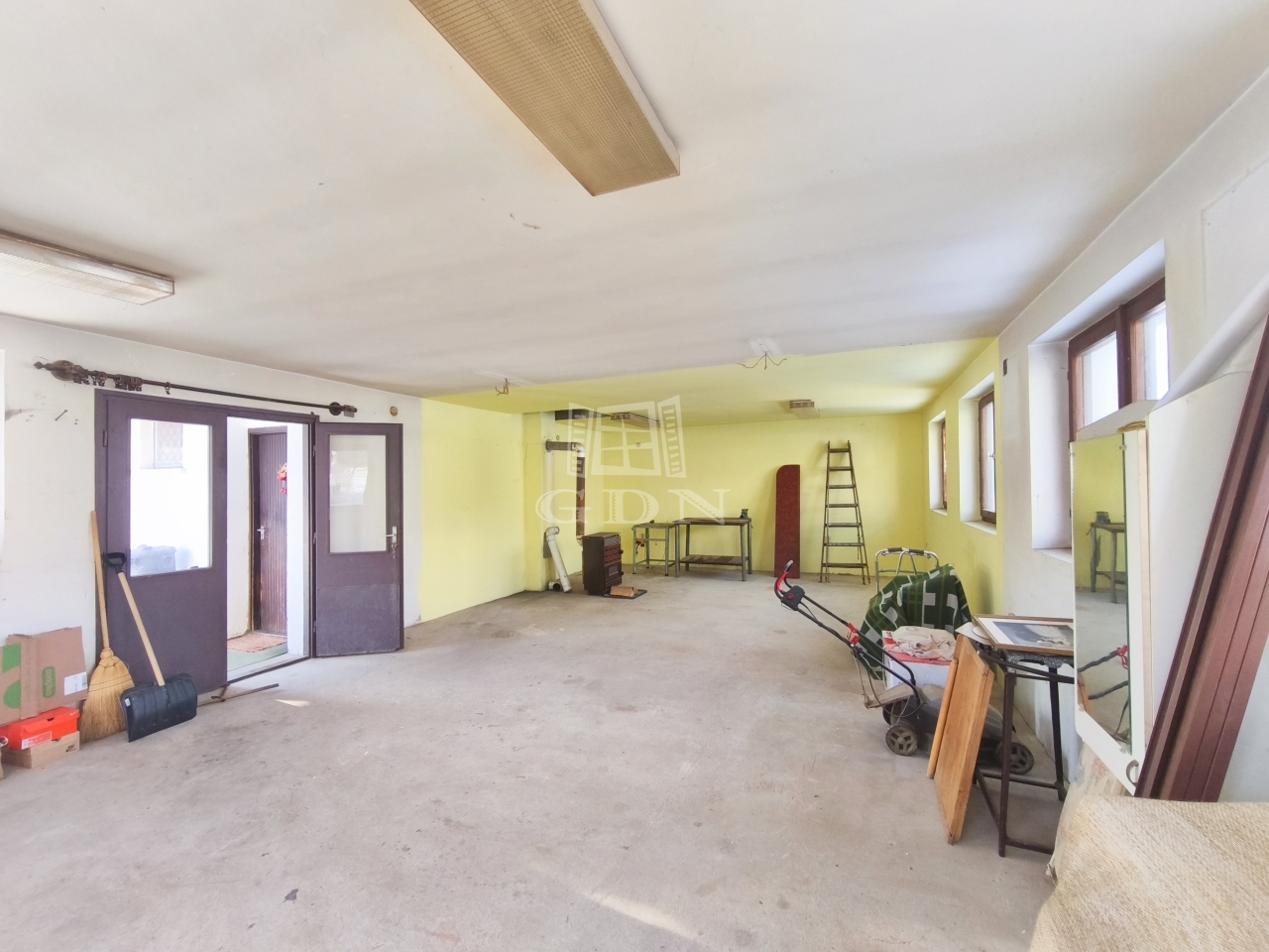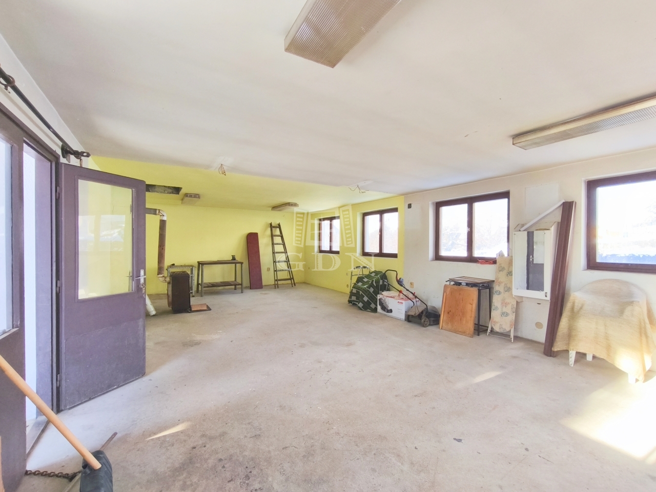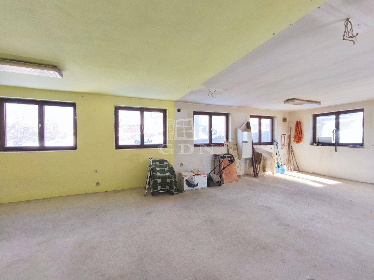 Alatta egy hasonló méretű, világos, többablakos helyiség található, amely ideális lehet közösségi térnek, hobbiszobának vagy műhelynek.