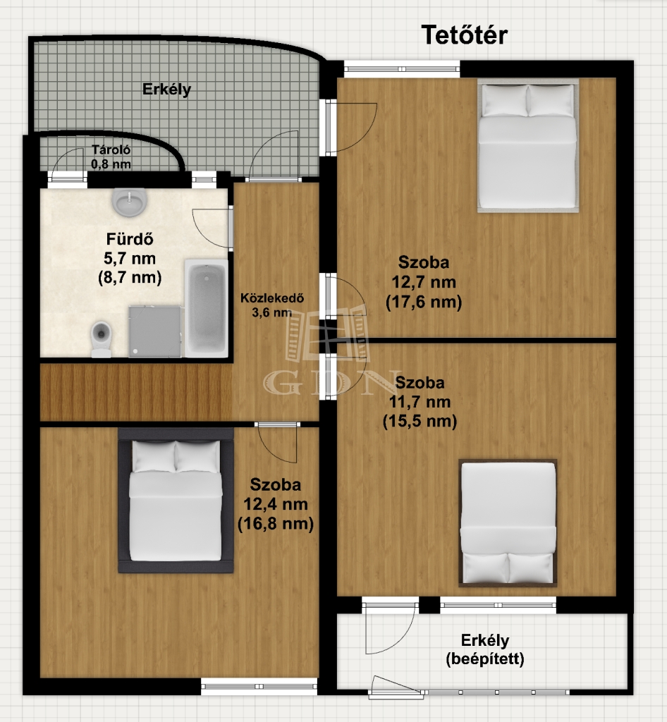 Az emeleten három háló található, amelyek közül kettő erkélykapcsolatos, valamint egy tágas fürdőszoba káddal és zuhanyzóval. A felső szintről nyíló fedett erkélyek tovább növelik az ingatlan komfortját és élhetőségét.
