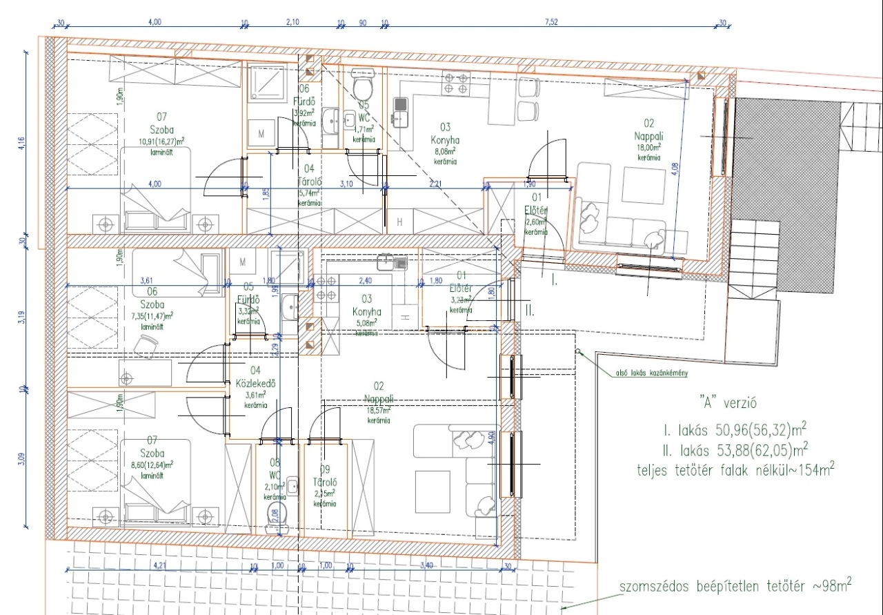 • a másik lakás 54 m² alapterületű, mindkettő amerikai konyhás nappali + 2 szobás elrendezéssel.