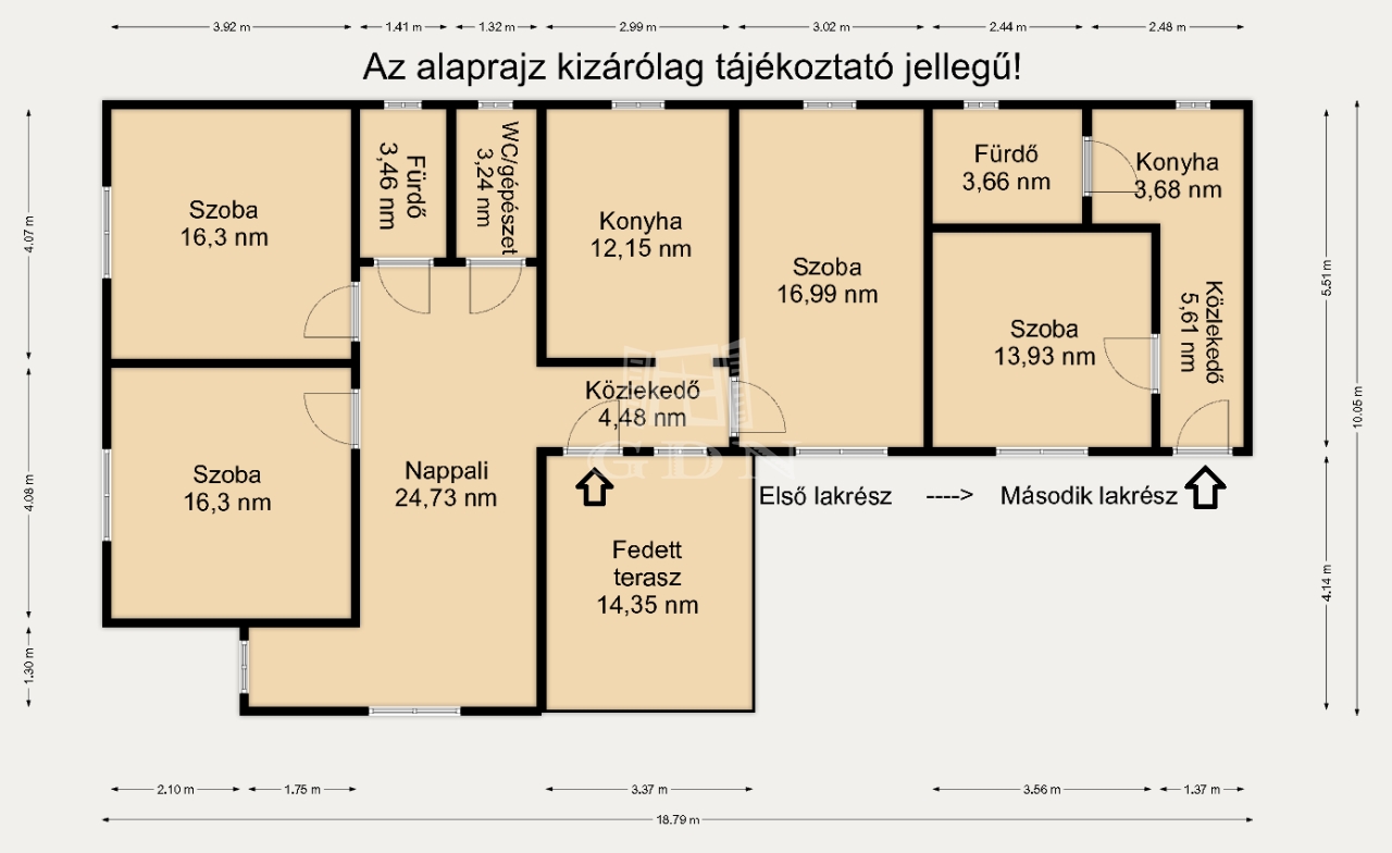 Az épületet kondenzációs gázcirkó padlófűtéssel, 2 lakrész, 3 + 1 szoba, lakrészenként konyha. nappali, lakrészenként fürdőszoba, valamint egy 14,35 nm-es terasz jellemzi.