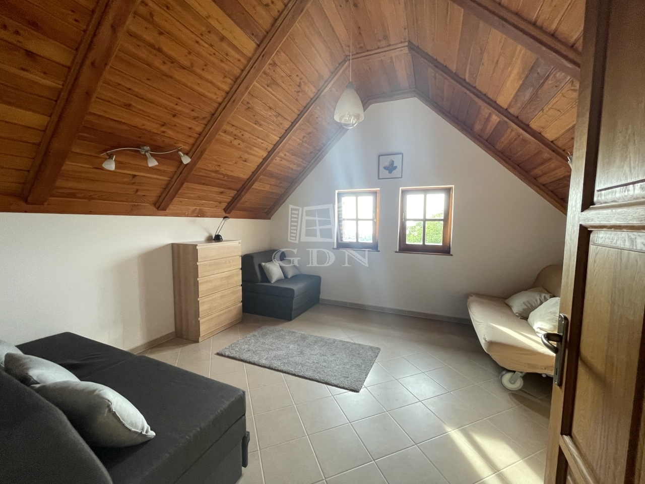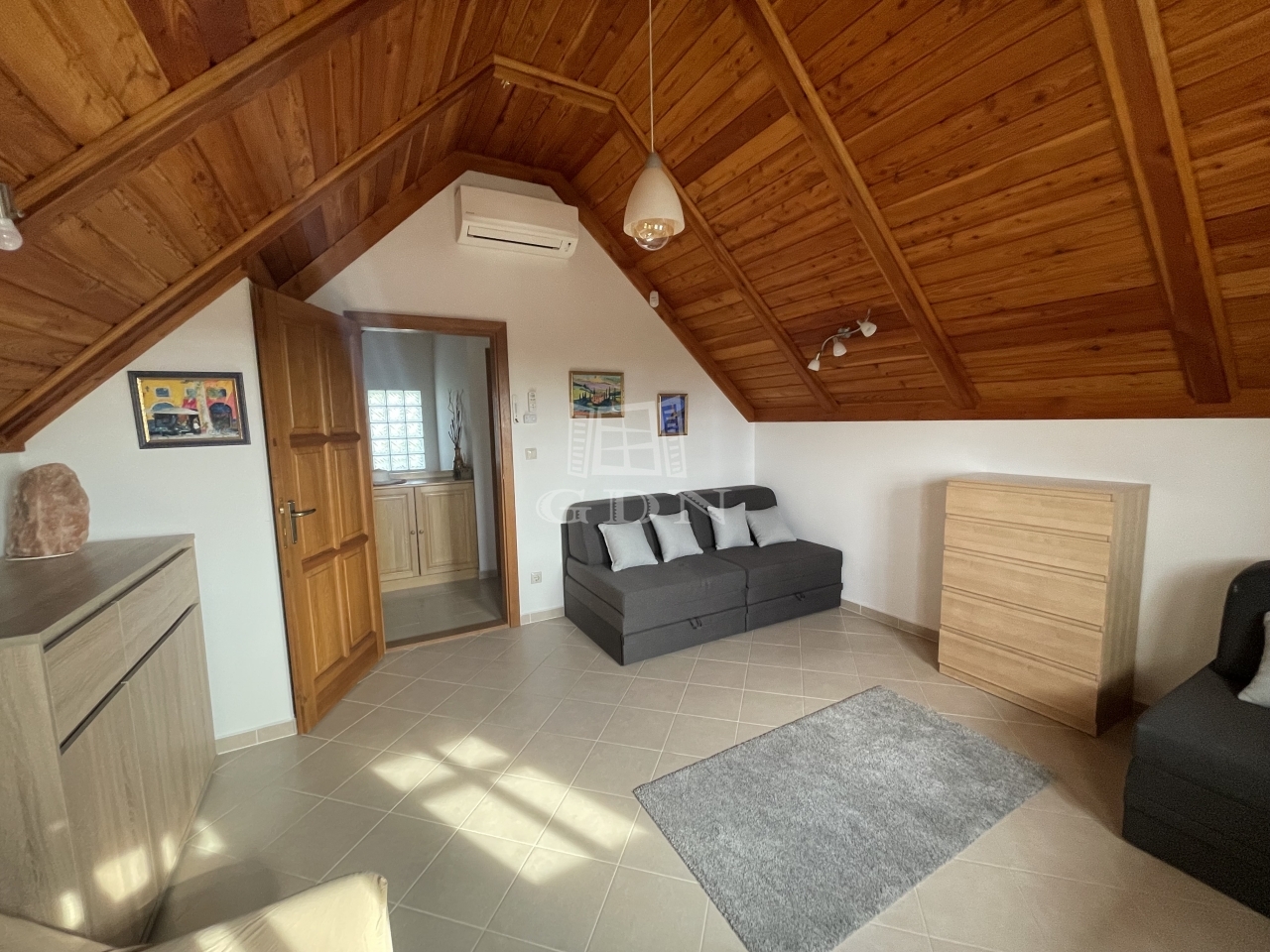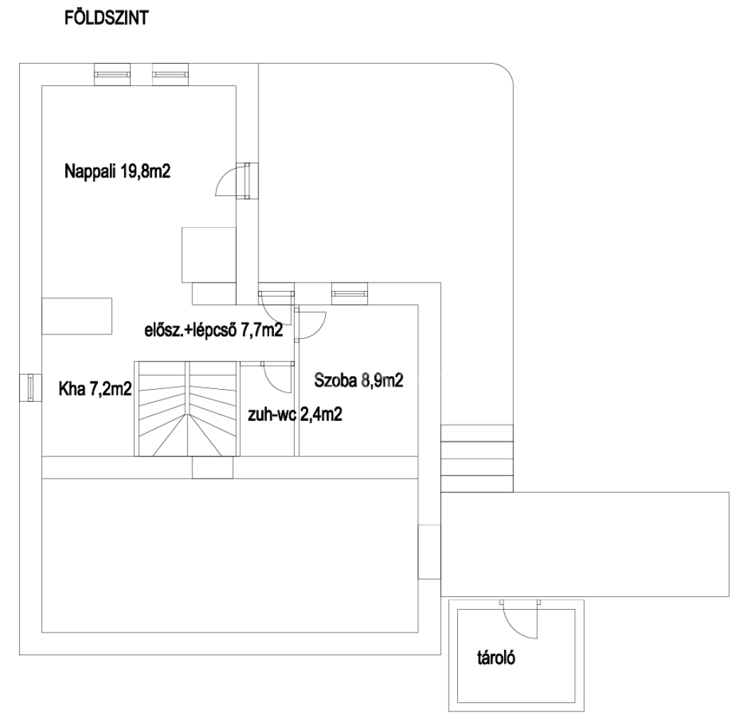 Földszint: nappali + étkező (19,8 m²) + konyha (7,2 m² ) légtérben split klímával, vendégszoba (8,9 m²) + zuhanyzós fürdő (2,4 m²)