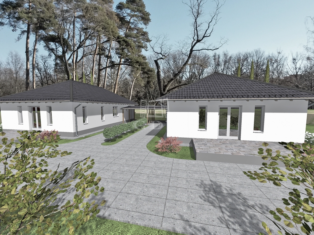 A két ingatlan kizárólag a fedett autóbeállón keresztül érintkezik egymással.