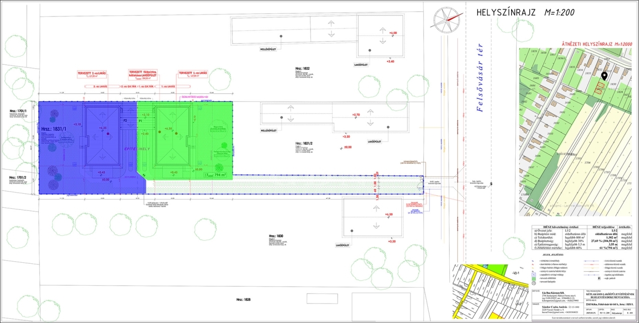 Az első házhoz 470 m²-es, míg a hátsó házhoz egy 560 m²-es, kizárólagos használatú, lekerített telekrész tartozik.