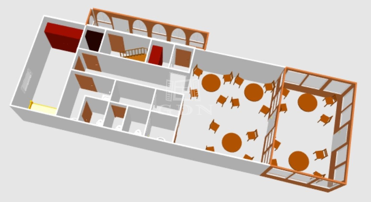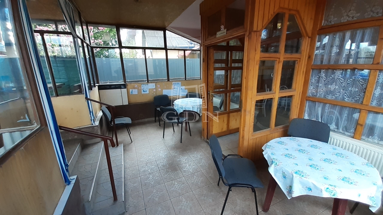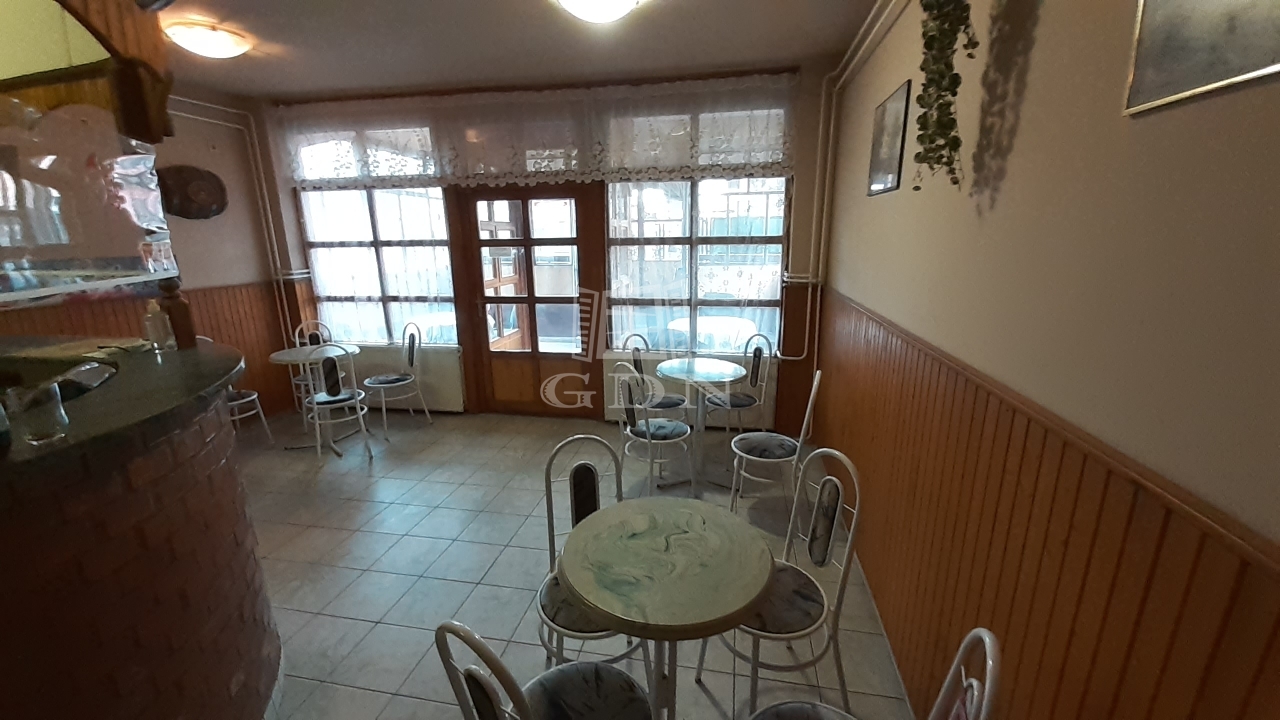 A földszinten található egy régóta működő vendéglátó egység, melyet további üzemeltetésre át lehet venni, de természetesen más jellegű vendéglátásra is átalakítható az épület.