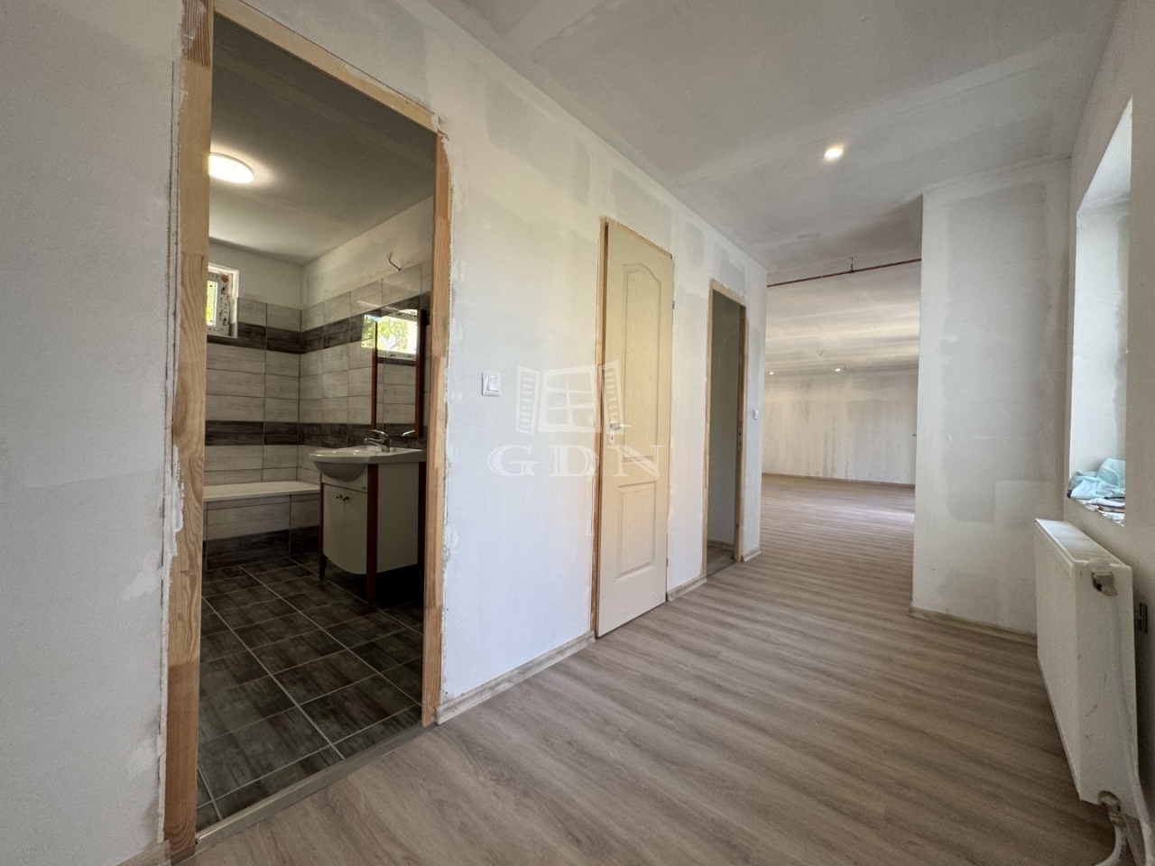 Amerikai konyhás nappali, közlekedő, 3 tágas hálószoba, fürdőszoba, vendég WC, háztartási helyiség került kialakításra.
