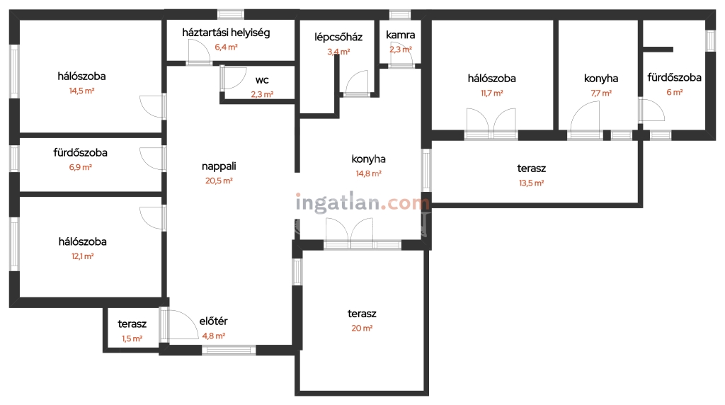 Az ingatlan helyiségei a fő épületben mely nettó 87 m2: előtér, nappali, konyha teraszkapcsolattal, két teljes értékű hálószoba, fürdőszoba káddal és zuhanyzóval,kamra, háztartási helyiség, vendég toalett kézmosóval, lépcsőház, pince +30 m2, fedett terasz +20 m2..