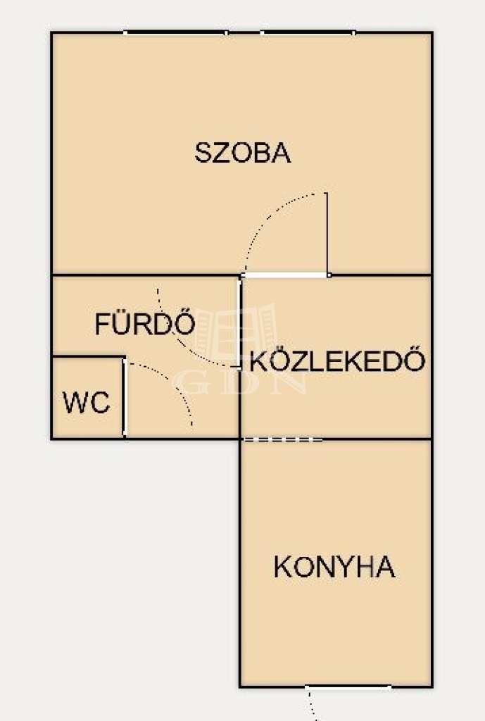 A földszinti ingatlan 38 négyzetméteres, egy szobás kialakítású. A nagyméretű szoba lehetővé teszi egy kényelmes méretű hálósarok leválasztását, így külön nappalihelység is kialakítható, akár a köztlekedő összenyitásával is. Fördőszobája zuhanyzóval és külön ajtóval leválasztott mellékhelységgel felszerelt.