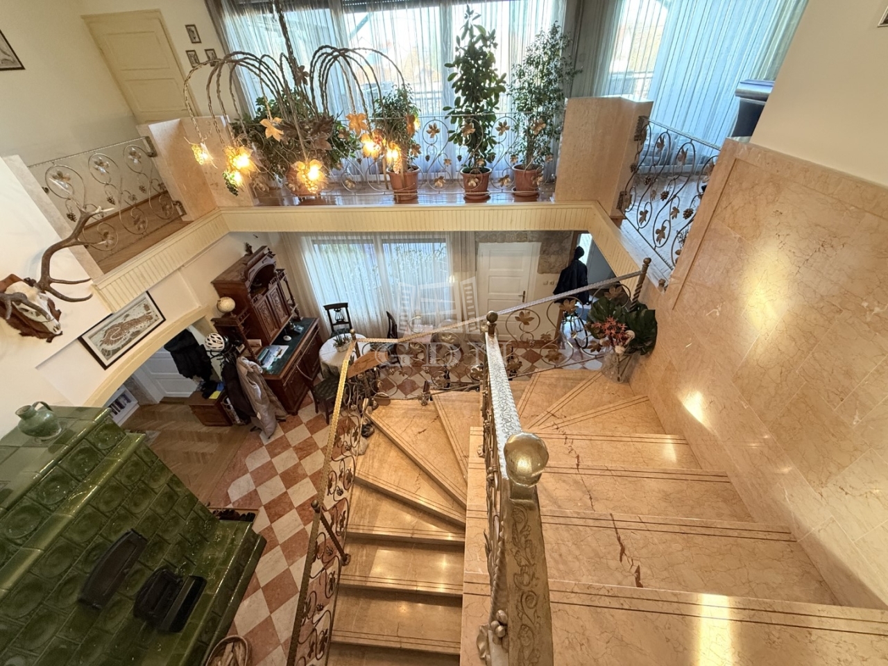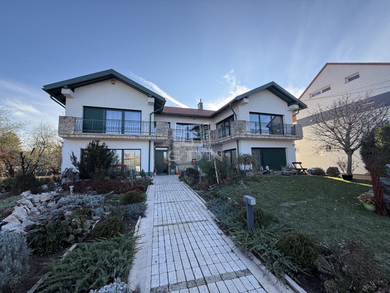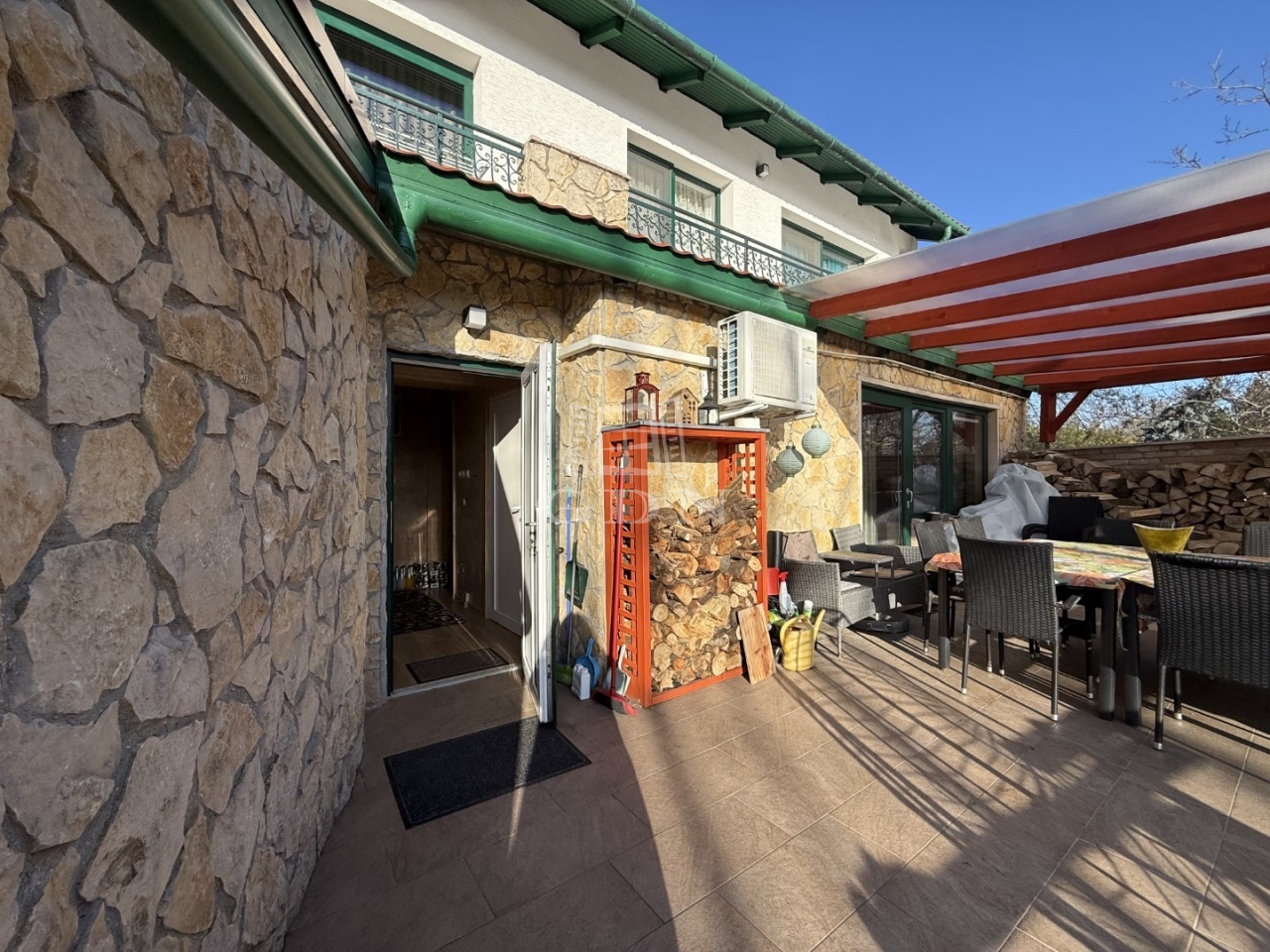 A mediterrán stílusú épületnek 2 bejárata van nagy terasszal. A felső teraszról pompás kilátással a kertre.