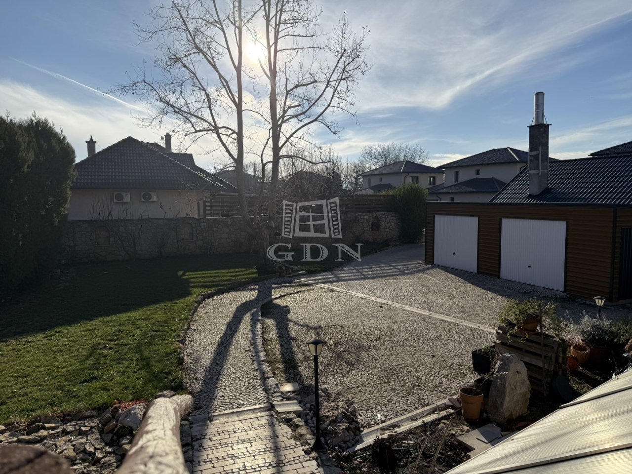 A kert szépen gondozott, parkosított. A hátsó telekrészen került kialakításra egy melléképület, garázs 2 autó befogadására alkalmas, és térkövezett beálló.