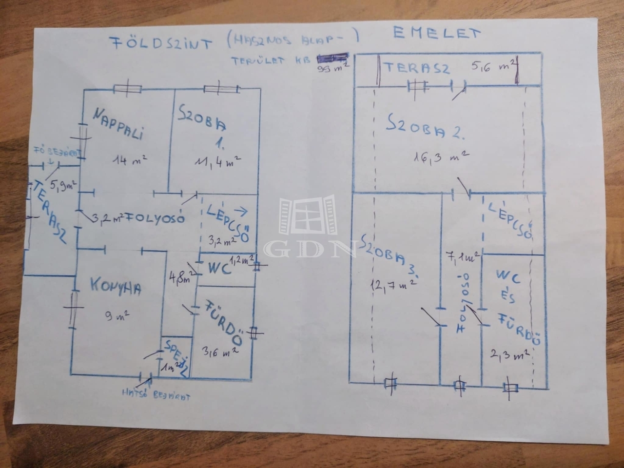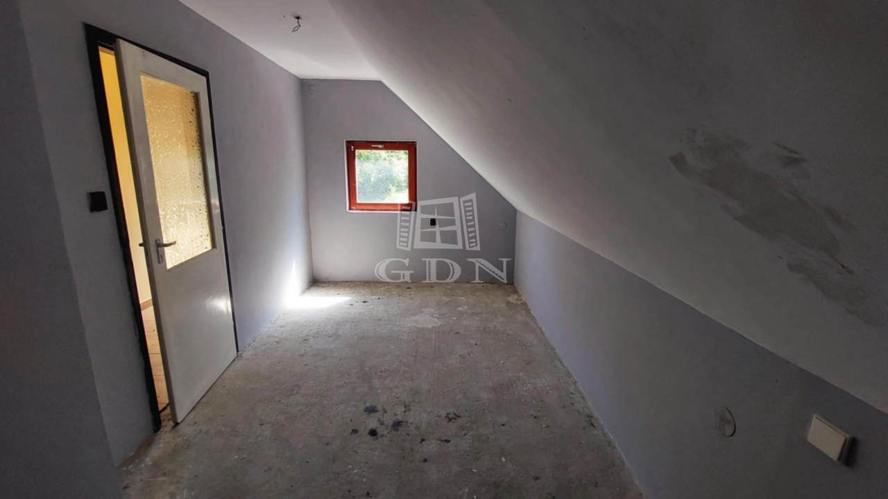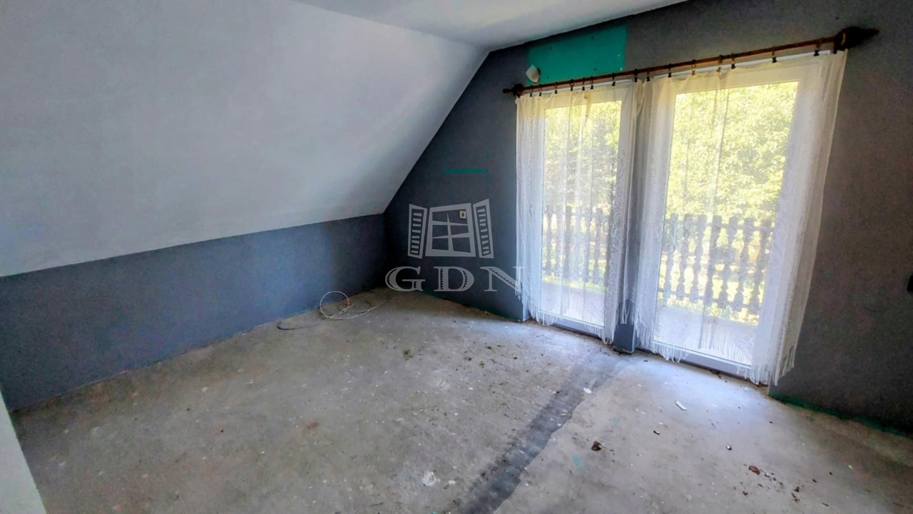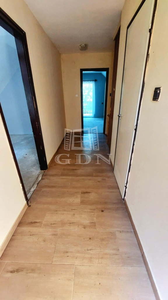 Emelet: két szoba (az egyik erkélyes), közlekedő, valamint egy fürdőszoba kialakítására alkalmas helyiség (még nincs befejezve)