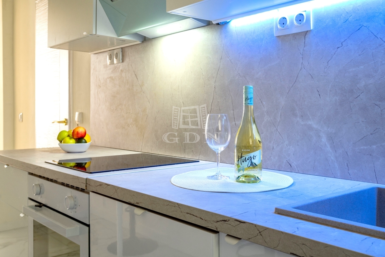 A 23 m²-es nappali tágas és világos, frissen felújított faparkettával. Itt kapott helyet egy nagyméretű, tükrös gardrób, ami tényleg elnyeli a holmikat – nem kell külön tárolással küzdeni, de ha több tárolóhelyre van szükséged, az is megoldható.