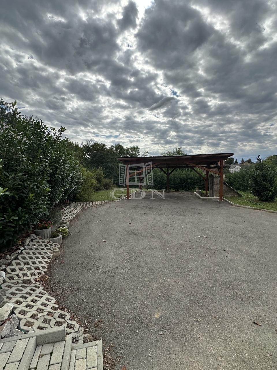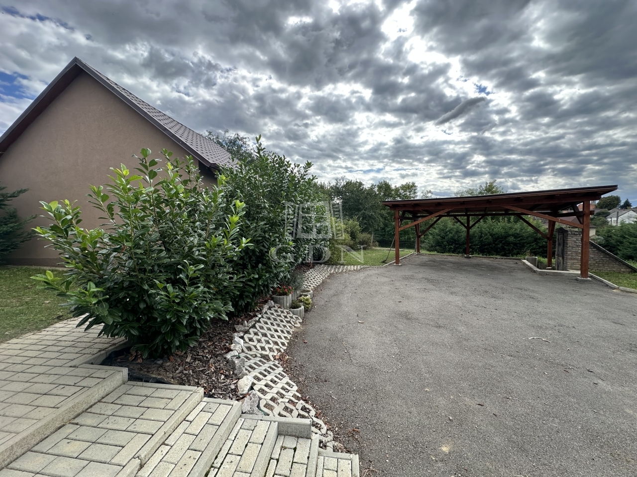 Az udvar egy része térkővel borított, két gépkocsi tárolására a fedett beállóban adott a lehetőség. A telken egy téglával kirakott, jó állapotú pince is teret kapott.