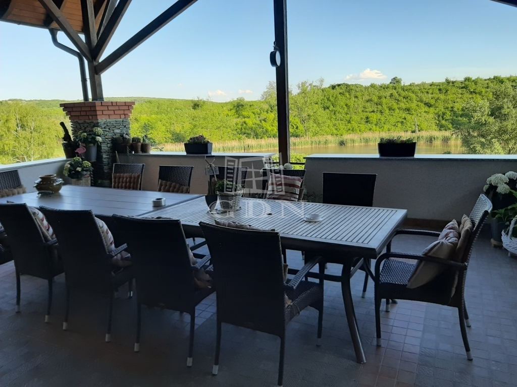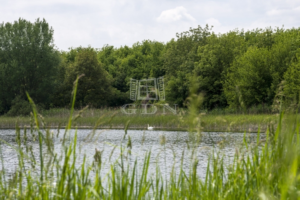 Az épület nappalijából nyíló hatalmas erkélyről a természet színes világában és a halastó csillogó vízfelületében gyönyörködhetünk.