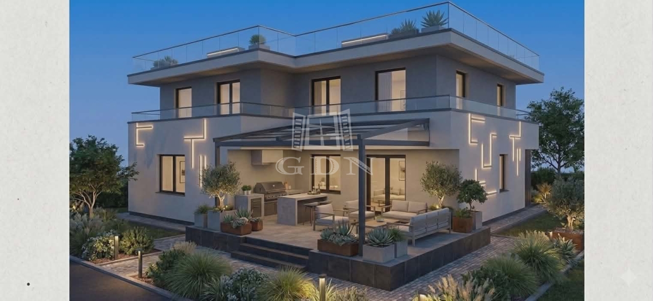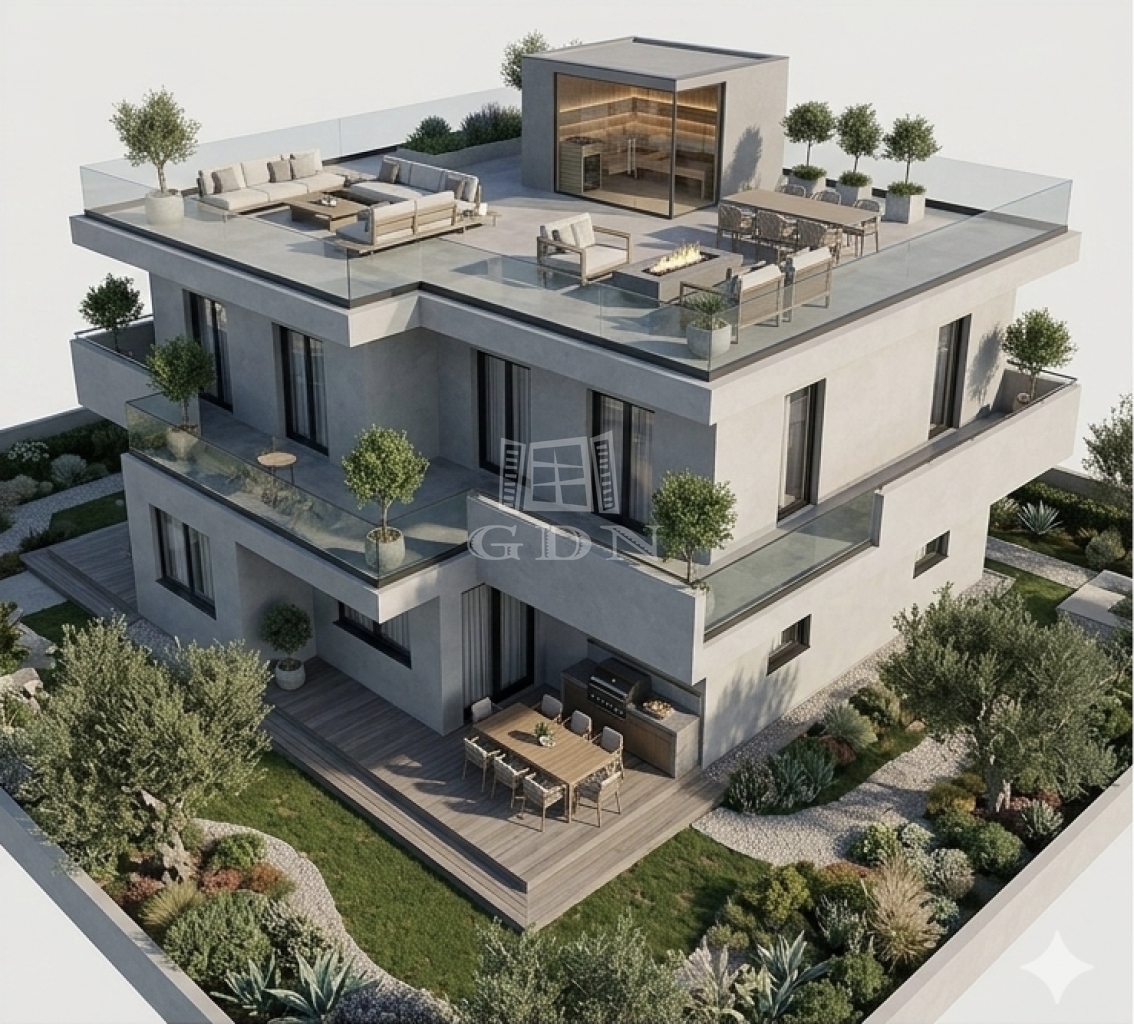 nettó alapterülete 98 nm + 57 nm + 120 nm privát tetőterasz + 200 nm saját kertrész.