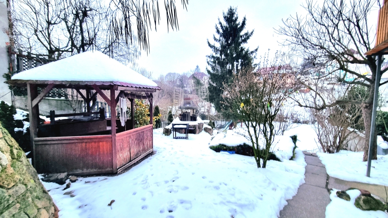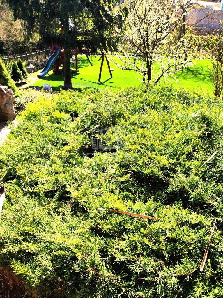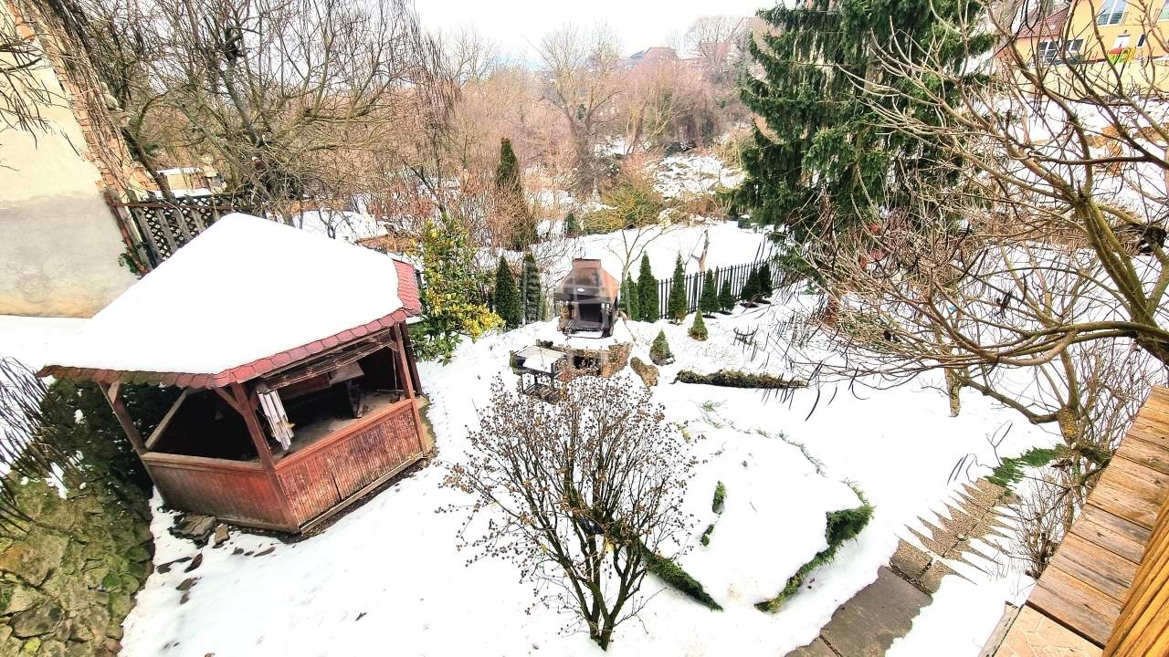 Az 1226 nm-es, gondozott telken, 2 garázs, 2 fedett kocsibeálló, +10 autónak parkoló épült.