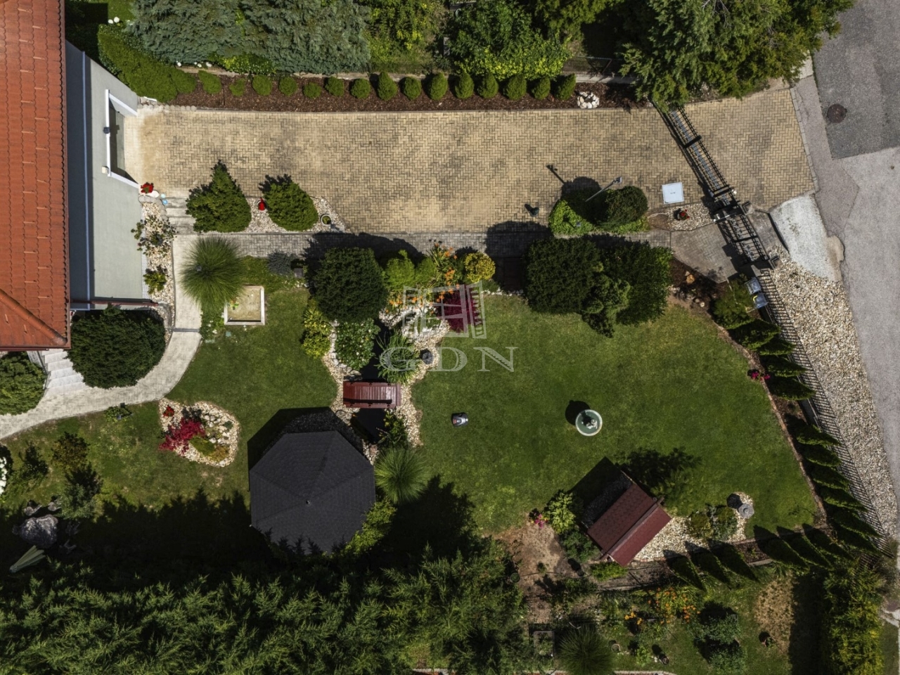 A kovácsoltvas kapun át juthatunk a gyönyörűen parkosított kertbe, ahol a garázs mellett több autó számára térkövezett beálló is rendelkezésre áll.