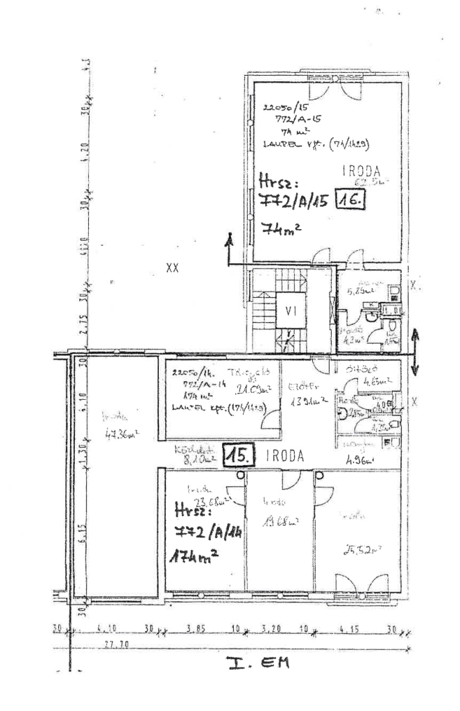 A hirdetésben szereplő iroda 79m2 alapterületű és az első emeleten található. A bérlemény elosztását tekintve egy tágas, egy-légterű irodahelyiségből, egy teakonyhából, valamint egy a folyosón található, sajáthasználatú mosdóból áll.