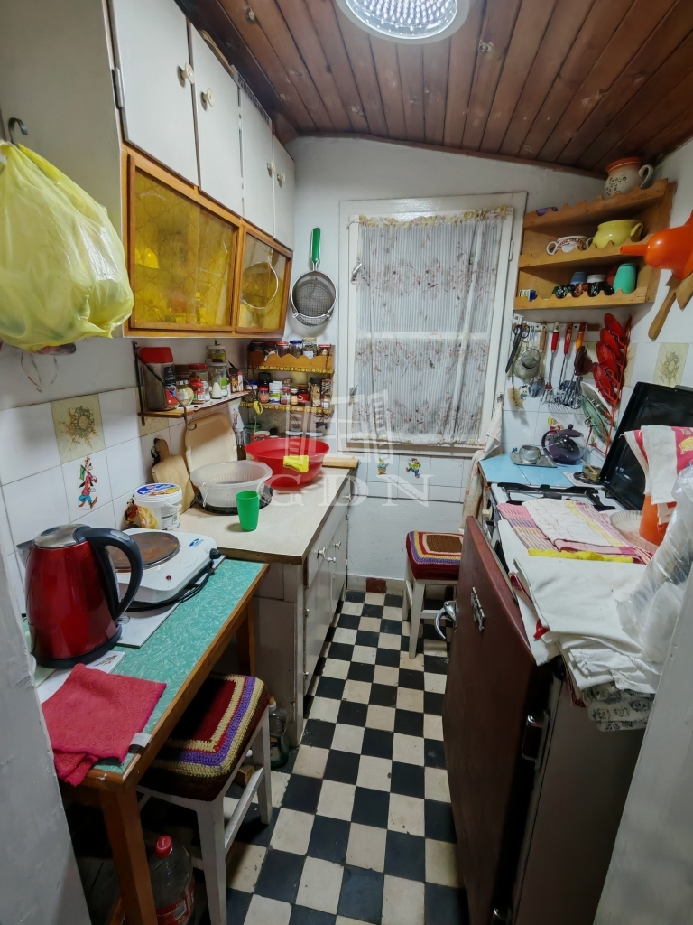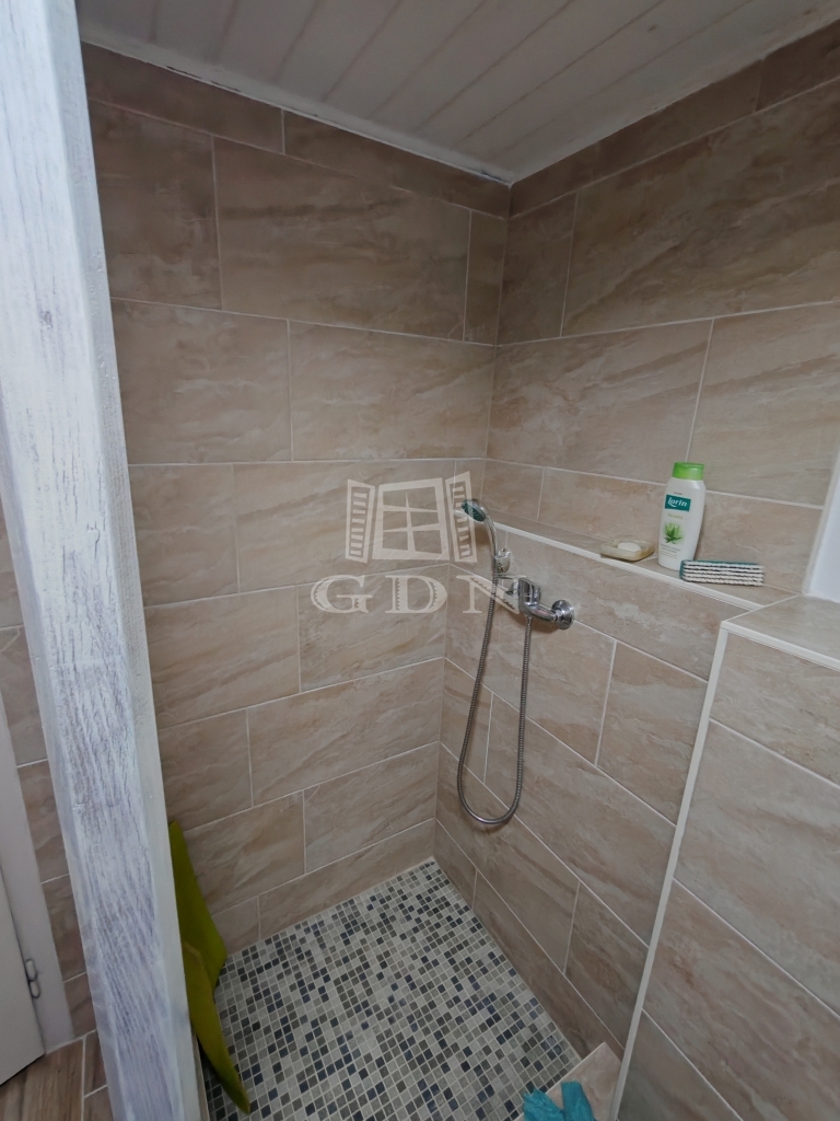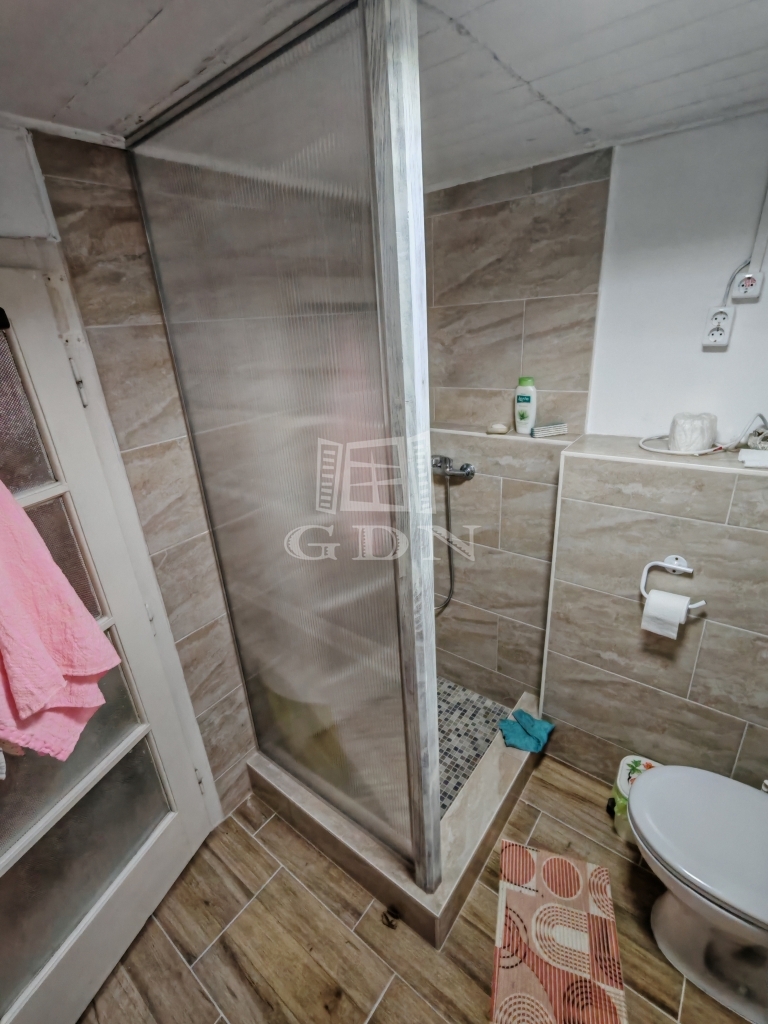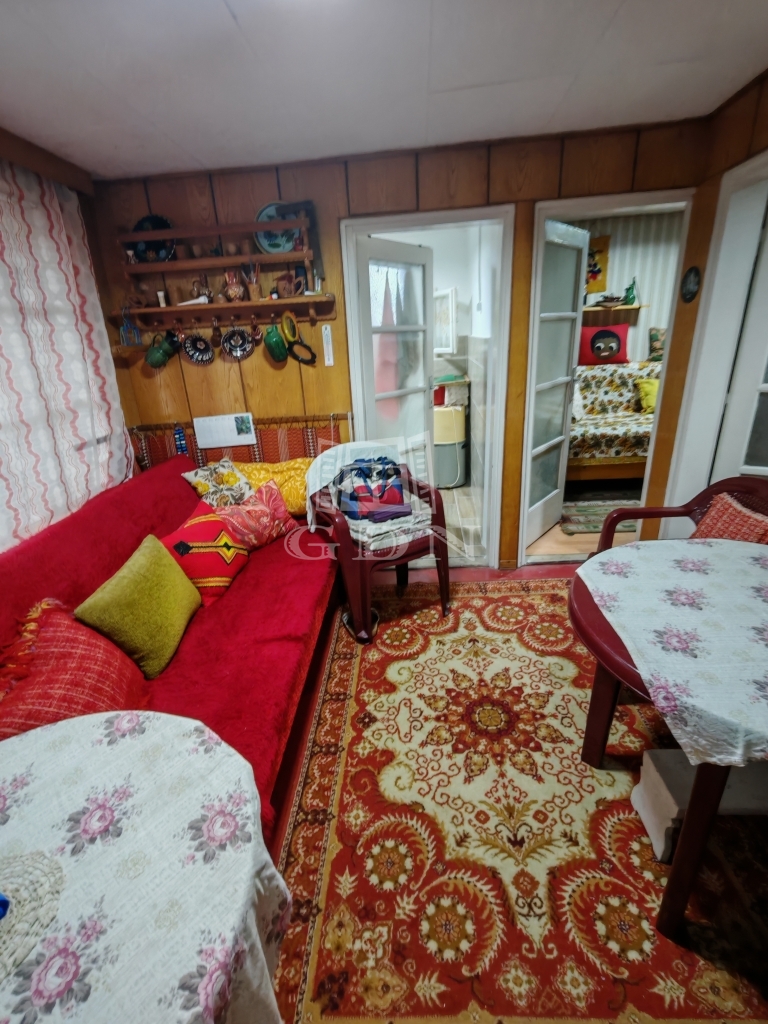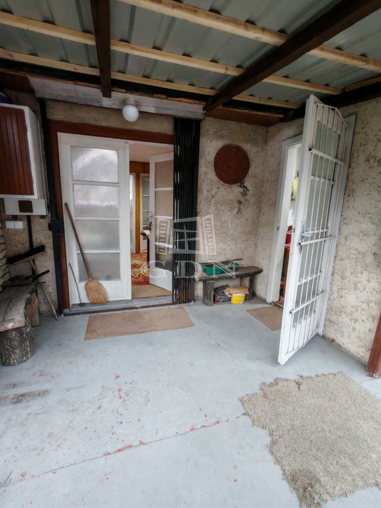 A kisházban két pici szoba egy nappali és egy zuhanyzós fürdőszoba+wc található. A konyha jelenleg a verandáról közelíthető meg,de ez könnyen beépíthető. Jelenleg a veranda még 15 nm.