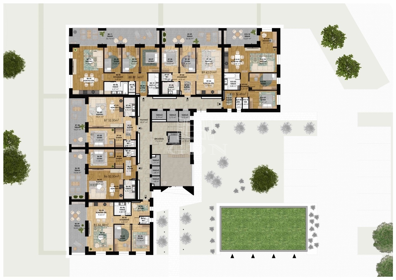 Modern megjelenésű, értékálló, kényelmes és élhető lakóparkban valamint az épületekhez kapcsolódó egyedi lakókörnyezetben szeretne élni? Hamarosan megvalósulhat az álma. A Gyöngyös-patak partján belváros közeli prémium lakások épülnek 20 000 m2-es területen, több ütemben. A tervezés során a funkció, a környezettudatosság és a kényelem voltak a legfontosabb tervezési szempontok. Így különösen az épületek szellős elhelyezése, a lakások kedvező tájolása, az épületek körül a maximális zöldterület és a megfelelő garázs szám biztosítása, a színvonalas közösségi funkciók kialakítása. A lakások értékállóságát és kényelmét az átgondolt tervezés, a minőségi anyagok használata, a nagyméretű, intim teraszok, a lift, a megújuló energia, egyedi és közös tárolók, fedett beállók, garázsok biztosítják. Az alkalmazott szerkezetek megfelelnek a ma érvényes “közel nulla energiaigényű épületek” követelményeinek. Az épületek előtti sétányok díszkivilágítást kapnak mozgás- és alkonykapcsolás vezérlésével. A sétányokról különböző típusú gépkocsi beállóhelyek – felszíni fedett, és normál parkolók ill. garázsok - közelíthetők meg. Egyes parkolók között beruházói döntés szerinti helyen és műszaki kialakítással, elektromos töltőpont csatlakozási lehetőség biztosítható. A közös területek alkalmasak játékra, pihenésre, a földszinti lakások előtti kijelölt zöldterület saját használata mellett. A ház kaputelefon rendszerrel lesz felszerelve. A lépcsőházban és egyéb közös terekben légterenként időkapcsolós világítás lesz kiépítve. A mai korszerű követelményeknek, az épületek hő és hangszigetelése a vonatkozó szabályoknak maximálisan megfelel. A külső hőszigetelés vastagsága 16-20 cm. Az ablakok 3 rétegű üvegezéssel kiváló hőszigetelésű nyílászárók. A lakások padlófűtéssel rendelkeznek, mely a szabadabb belsőépítészeti kialakításoknak ad lehetőséget. A tervek szerint a központi gépészet távfelügyeleti rendszerrel ellátott, távfűtés, így a karbantartás és üzemeltetés során ez gyors beavatkozást és üzembiztonságot eredményez. A fogyasztás egyedi mérőkkel mért, az elszámolást a közös képviselő végzi. A megújuló energia tervek szerint a megfelelő energetikai szabályok alapján kerül telepítésre pl. napelemrendszer. (Kiviteli terv során változhat: kondenzációs gázkazán és/vagy hőszivattyú). Belsőépítész által tervezett lakások, nagy teraszokkal kapcsolódnak a természethez. Befektetőknek, nagy családoknak alkalmas lakások kerülnek kialakításra. A kisebb lakások 52 m2, 62 m2, a nagyobb lakások 67 m2, 76 m2 és 89 m2 nagyságúak lesznek. 12-33 m2 fedett intim teraszok kerülnek kialakításra. Aktuális, bevezető ajánlatban az 1db felszíni parkolót, vízlágyító rendszert, klíma előkészítést ajándékba adja a beruházó. A lakásokhoz tárolók, garázsok vásárolhatók. Kimerítőbb tájékoztatást személyesen. A hírfetésben szereplő lakás 1.emelet 6.