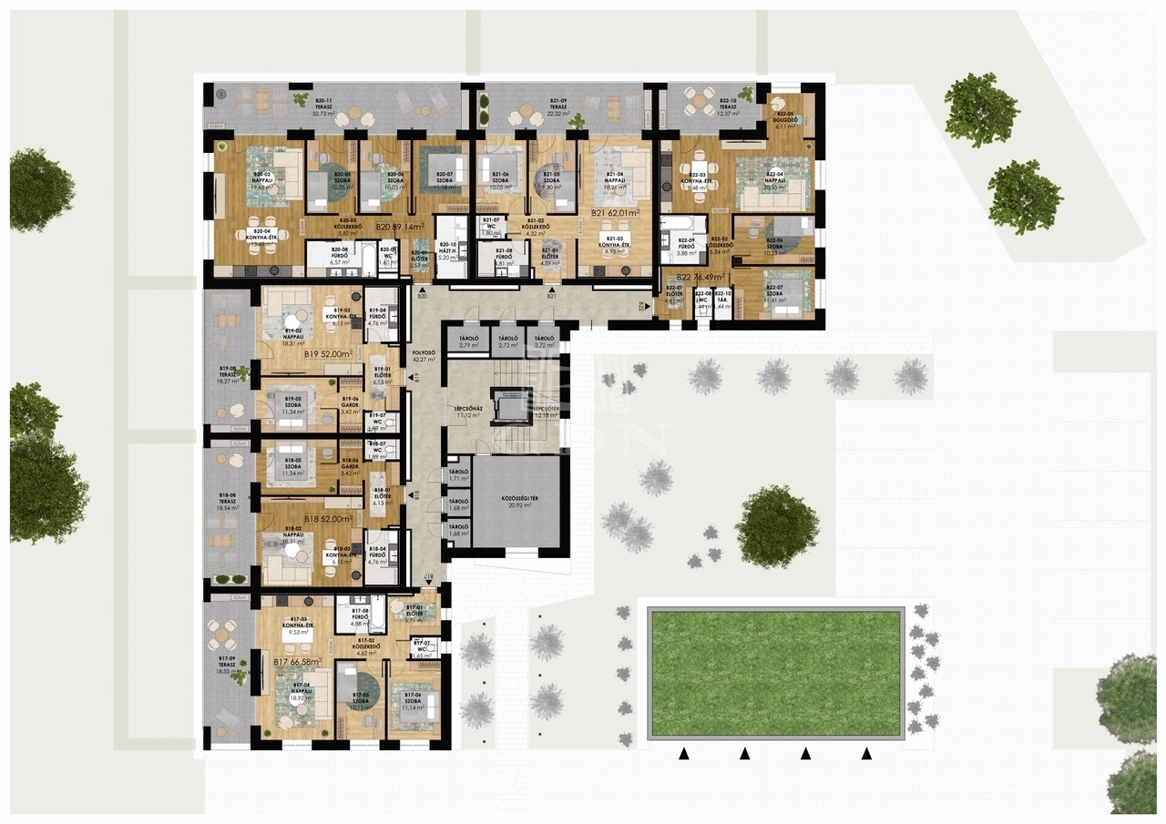 Modern megjelenésű, értékálló, kényelmes és élhető lakóparkban valamint az épületekhez kapcsolódó egyedi lakókörnyezetben szeretne élni? Hamarosan megvalósulhat az álma. A Gyöngyös-patak partján belváros közeli prémium lakások épülnek 20 000 m2-es területen, több ütemben. A tervezés során a funkció, a környezettudatosság és a kényelem voltak a legfontosabb tervezési szempontok. Így különösen az épületek szellős elhelyezése, a lakások kedvező tájolása, az épületek körül a maximális zöldterület és a megfelelő garázs szám biztosítása, a színvonalas közösségi funkciók kialakítása. A lakások értékállóságát és kényelmét az átgondolt tervezés, a minőségi anyagok használata, a nagy méretű, intim teraszok, a lift, a megújuló energia, egyedi és közös tárolók, fedett beállók, garázsok biztosítják. Az alkalmazott szerkezetek megfelelnek a ma érvényes “közel nulla energiaigényű épületek” követelményeinek. Az épületek előtti sétányok díszkivilágítást kapnak mozgás- és alkonykapcsolás vezérlésével. A sétányokról különböző típusú gépkocsi beállóhelyek – felszíni fedett, és normál parkolók ill. garázsok - közelíthetők meg. Egyes parkolók között beruházói döntés szerinti helyen és műszaki kialakítással, elektromos töltőpont csatlakozási lehetőség biztosítható. A közös területek alkalmasak játékra, pihenésre, a földszinti lakások előtti kijelölt zöldterület saját használata mellett. A ház kaputelefon rendszerrel lesz felszerelve. A lépcsőházban és egyéb közös terekben légterenként időkapcsolós világítás lesz kiépítve. A mai korszerű követelményeknek, az épületek hő és hangszigetelése a vonatkozó szabályoknak maximálisan megfelel. A külső hőszigetelés vastagsága 16-20 cm. Az ablakok 3 rétegű üvegezéssel kiváló hőszigetelésű nyílászárók. A lakások padlófűtéssel rendelkeznek, mely a szabadabb belsőépítészeti kialakításoknak ad lehetőséget. A tervek szerint a központi gépészet távfelügyeleti rendszerrel ellátott, távfűtés, így a karbantartás és üzemeltetés során ez gyors beavatkozást és üzembiztonságot eredményez. A fogyasztás egyedi mérőkkel mért, az elszámolást a közös képviselő végzi. A megújuló energia tervek szerint a megfelelő energetikai szabályok alapján kerül telepítésre pl. napelemrendszer. (Kiviteli terv során változhat: kondenzációs gázkazán és/vagy hőszivattyú). Belsőépítész által tervezett lakások, nagy teraszokkal kapcsolódnak a természethez. Befektetőknek, nagy családoknak alkalmas lakások kerülnek kialakításra. A kisebb lakások 52 m2, 62 m2, a nagyobb lakások 67 m2, 76 m2 és 89 m2 nagyságúak lesznek. 12-33 m2 fedett intim teraszok kerülnek kialakításra. Aktuális, bevezető ajánlatban az 1db felszíni parkolót, vízlágyító rendszert, klíma előkészítést ajándékba adja a beruházó. A lakásokhoz tárolók, garázsok vásárolhatók. Kimerítőbb tájékoztatást személyesen. A hírdetésben szereplő lakás 3.emelet 22.