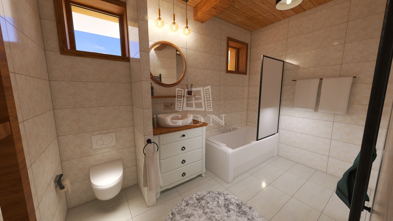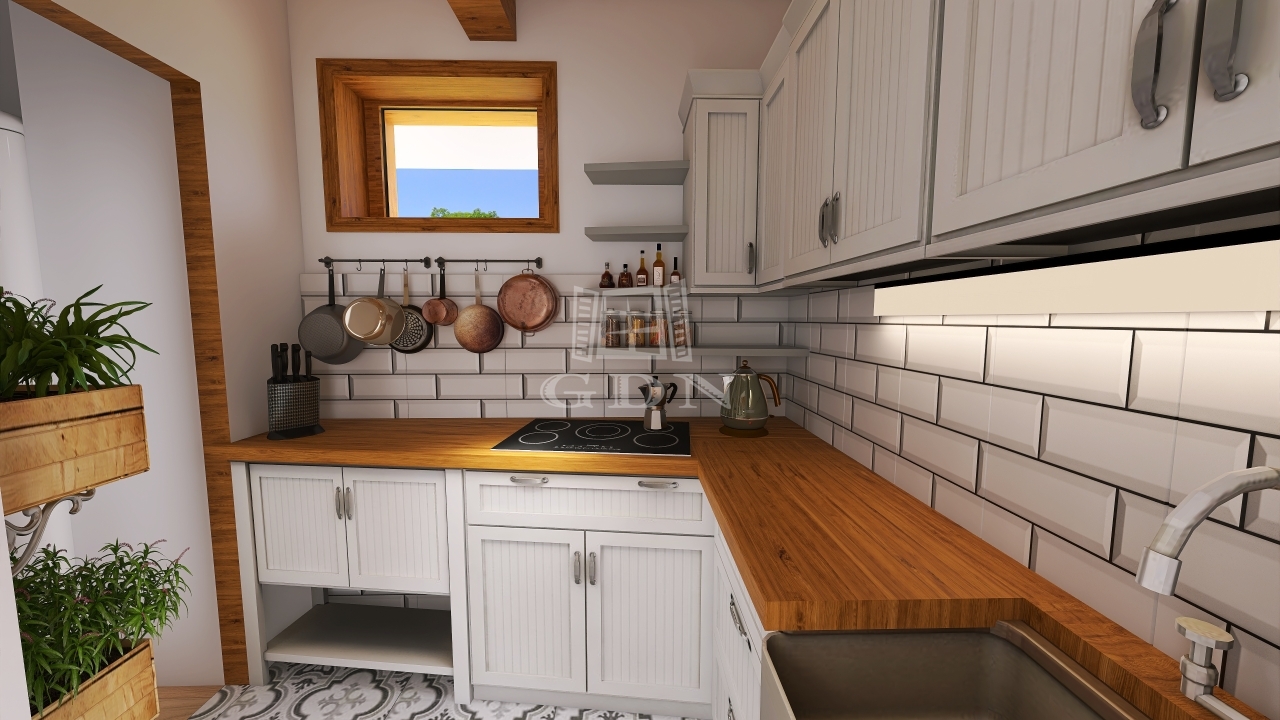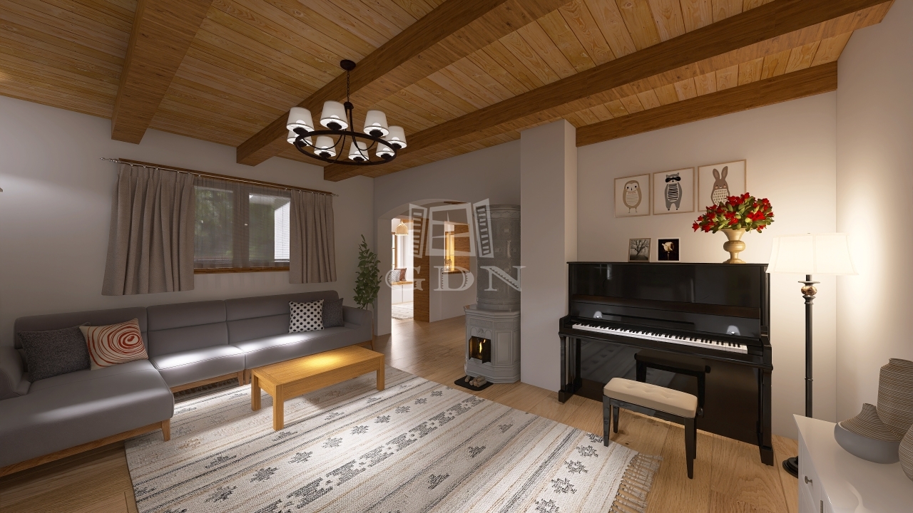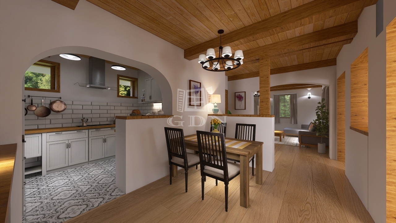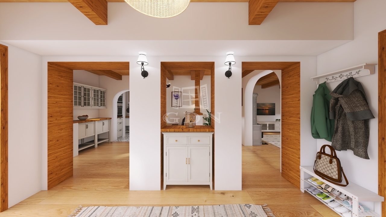A lakrész egy hangulatos teraszból, utcafronti nagy nappaliból, étkezőből, konyhából, tágas hálószobából és fürdőszobából áll. Az eredeti, százéves gerendák gondos felújításon estek át, megőrizve a ház autentikus báját.
