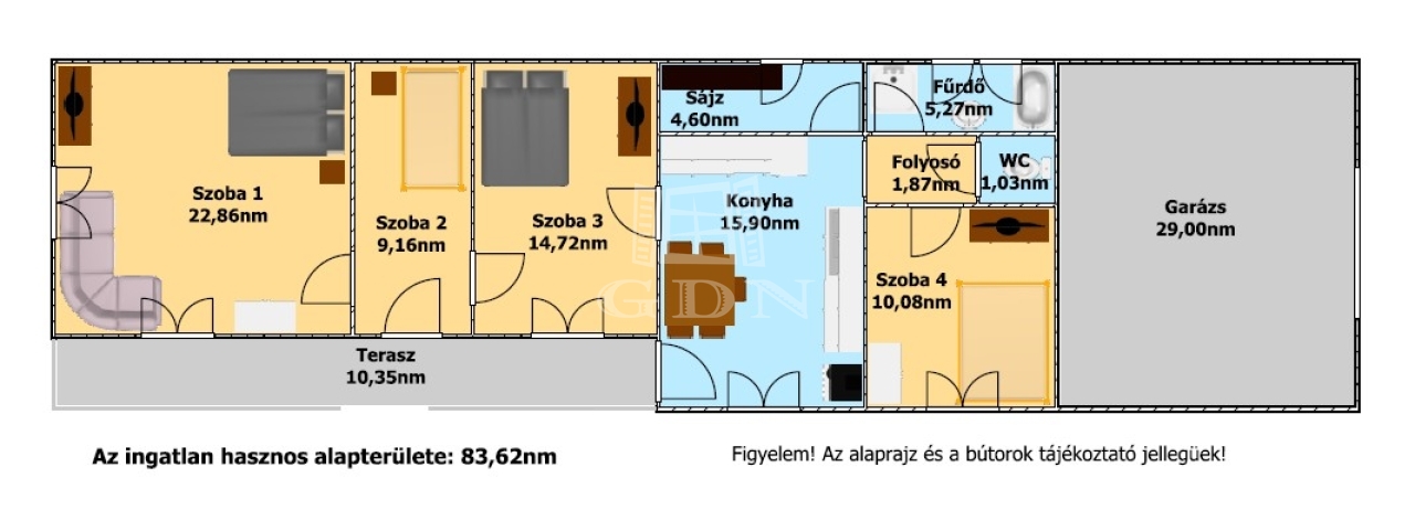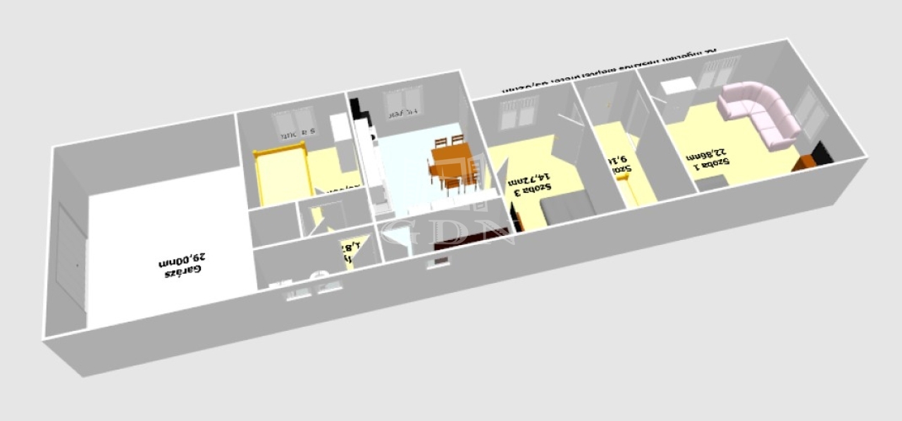 A házban négy szoba található, mely ideális választás lehet nagyobb családok számára. Az épülethez egy 10 négyzetméteres terasz is kapcsolódik, amely kiváló helyszín a kikapcsolódásra. Természetesen a terasz szükség esetén átalakítható előszobává is, melynek eredményekén a három első szoba és a konyha is ezen keresztül közvetlenül érhető el.