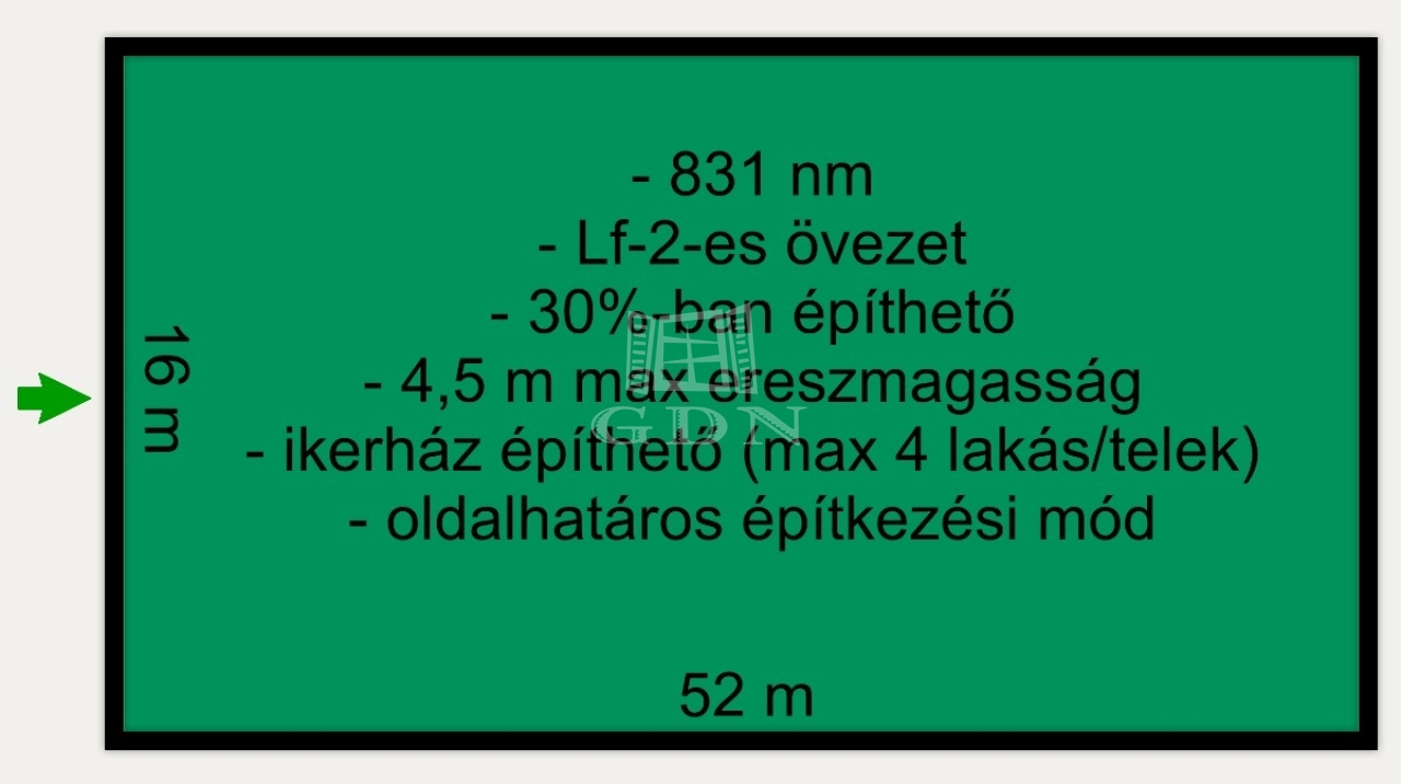 16 méter széles, 52 méter hosszú, minden közmű a telek előtt halad.
