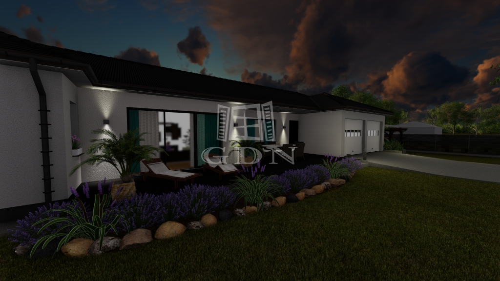 Jelen tervek szerint lakás alapterülete 151,33 m2 + 36 m2-es garázs + 43 m2-es terasz.