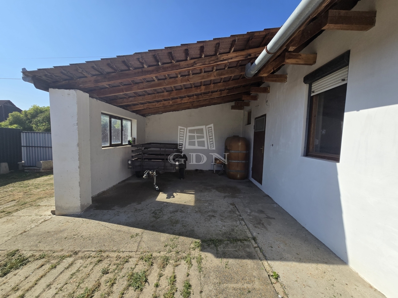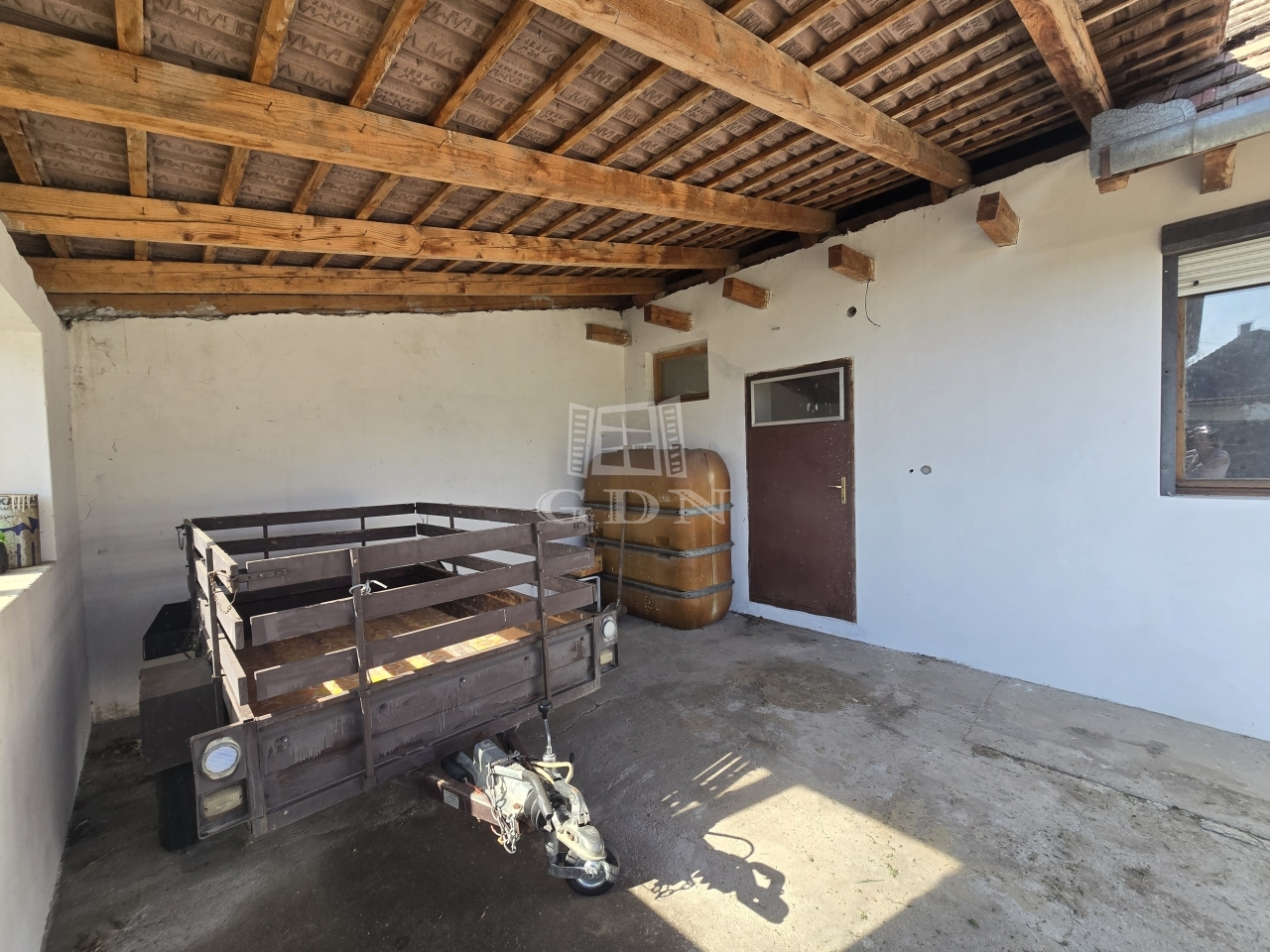 Fedett zárható garázs, fedett nyitott garázs, valamint a telek végében egy féltetős fedett beálló 3-4 autó számára