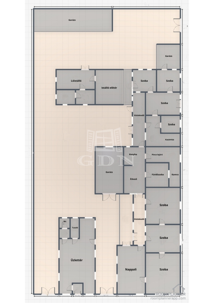 A főépület kb. 250 m²-es: jelenleg az első része lakótérként, a hátsó egy kávézóként funkcionáló térként lett kialakítva. Az ingatlan alkalmas családi ház + vállalkozás, kétgenerációs lakhatás, vagy akár teljes üzleti hasznosítás céljaira is.