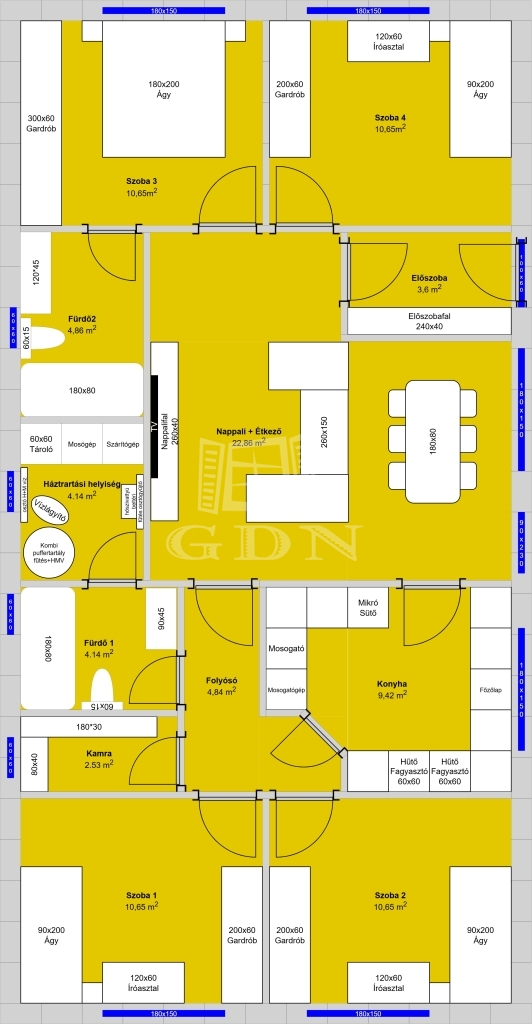 Tervezett elosztás: 4 hálószoba, amerikai konyhás nappali, 2 fürdőszoba, ablakos kamra