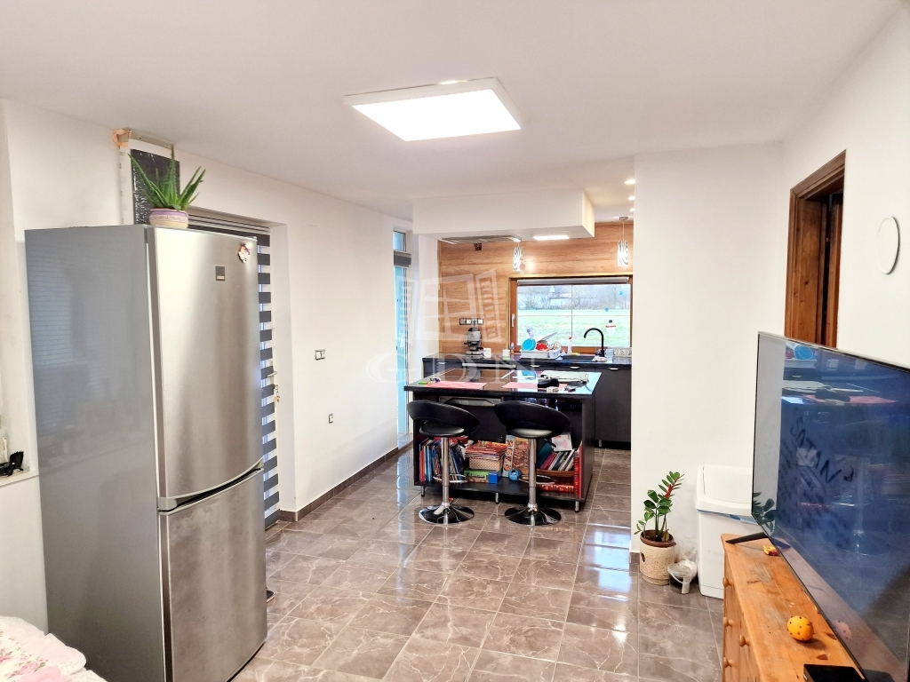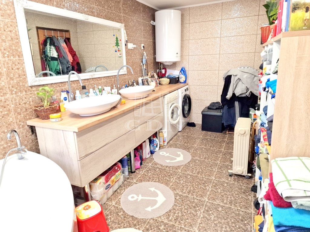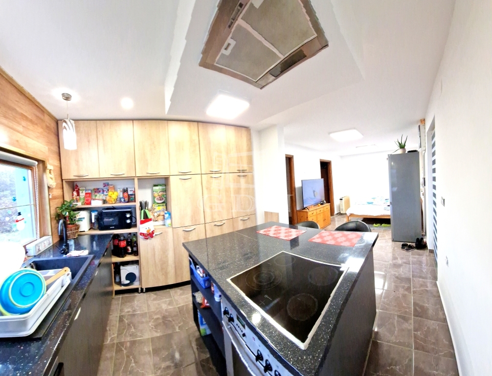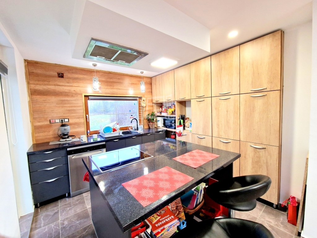 A házban jelenleg található egy világos, gépesített nagy konyha főzőszigettel - étkező helyiség, egy hálószoba és egy tágas fürdőkádas fürdőszoba.