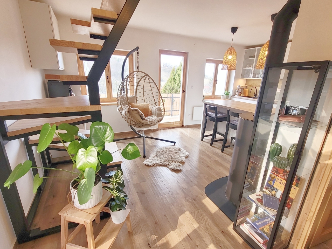 Az első szinten található a konyha és a fürdőszoba. A konyhát egyedileg tervezték és építették be. Ezen kívül egy konyhasziget és egy kis kávésarok is kialakításra került.