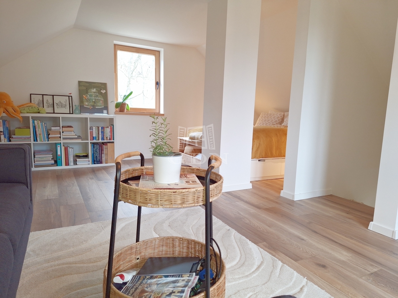 A második szinten található a hálószoba és a nappali. Erről a szintről egy félköríves erkély is megközelíthető.