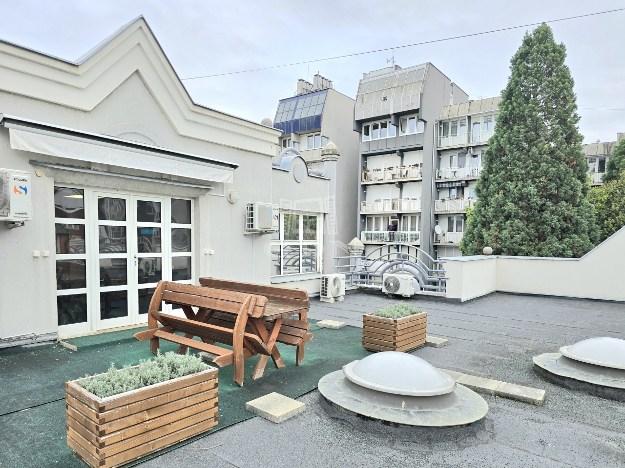 -200 m²-es, emeleti üzlethelyiség, hatalmas üvegportállal, tetőterasz használattal!