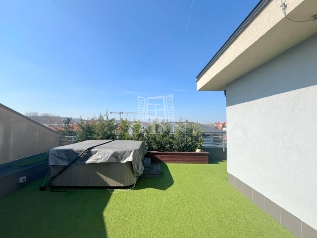 A lakás ékét, egyediségét jelentő, fantasztikus kilátással bíró teraszra több helyiségből is kijuthatunk, ahol a 7 személyes JAKUZZI is helyet kapott a kerti bútorok, a grillező és a focikapuk mellett, melyek mind a kellemes időtöltést biztosítják.