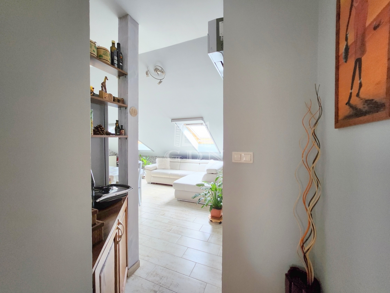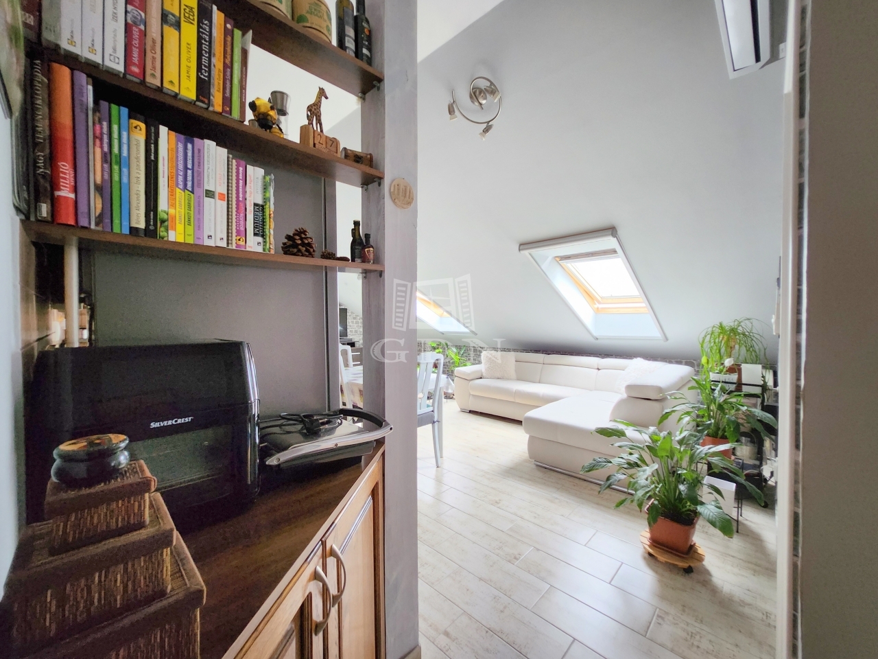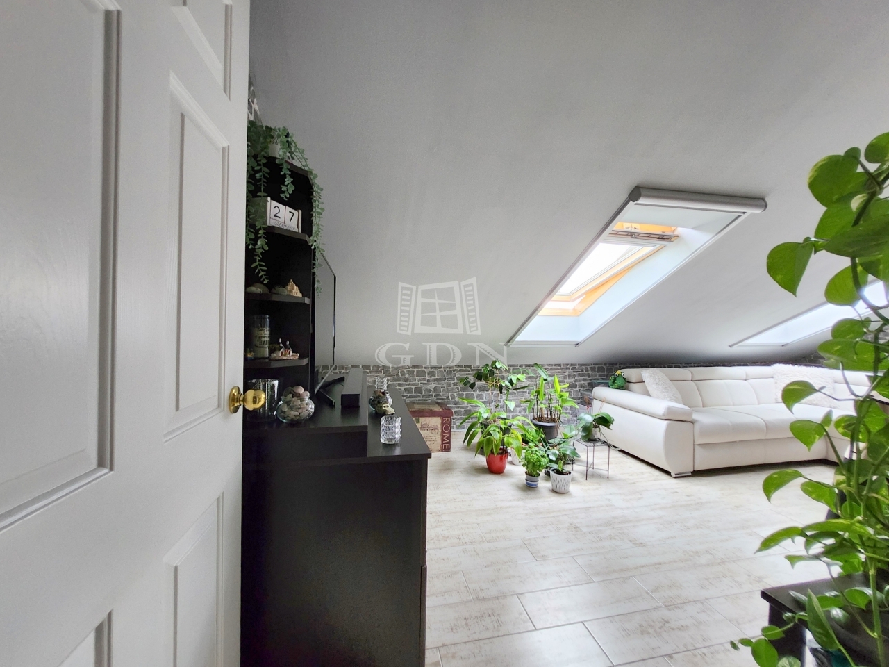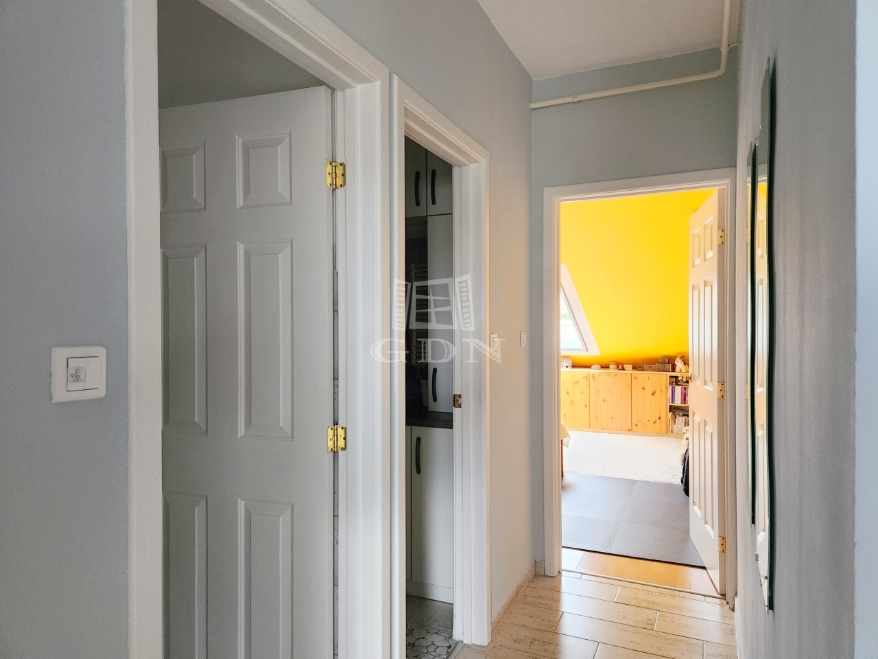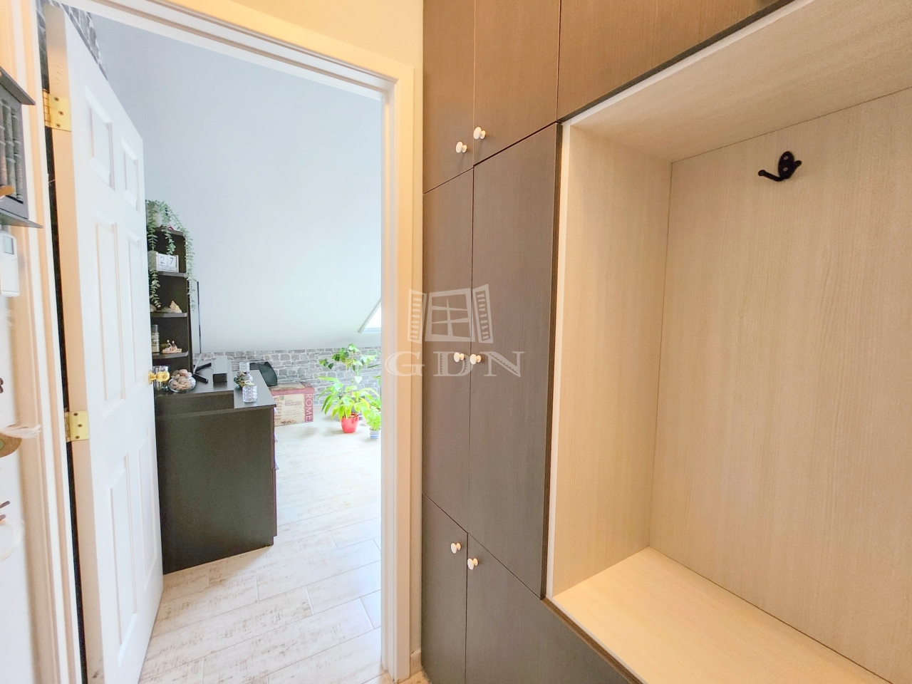 A maximális helykihasználtság érdekében a fürdőszobában, illetve a két hálóban a tetőtéri adottságokat figyelembe véve kifejezetten oda tervezett és gyártott szekrények kaptak helyet.