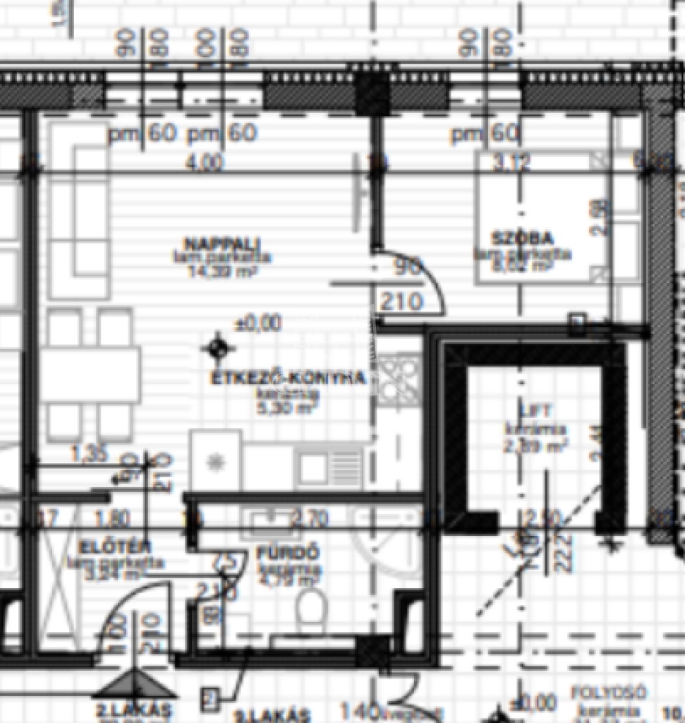 A feltüntetett ár földszint 2-es lakásra vonatkozik, 39 m2 lakótér, helyiségei: amerikai konyhás nappali, szoba, előtér, fürdőszoba.