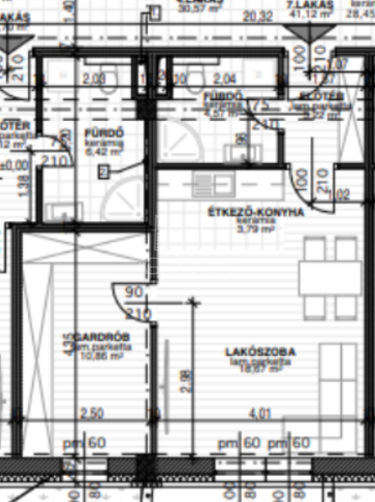 A feltüntetett ár földszint 7-es lakásra vonatkozik, 41,12 m2 lakótér, helyiségei: amerikai konyhás nappali, szoba, előtér, fürdőszoba.